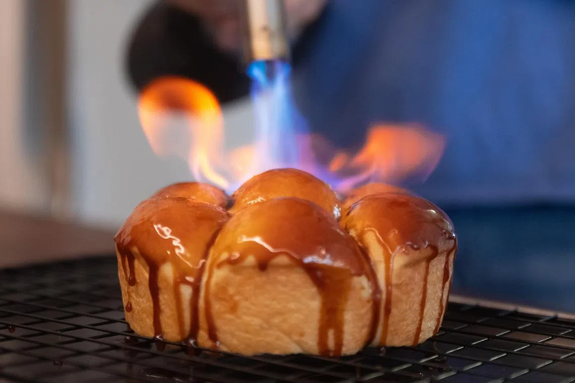 Pastry chef Elena Perez brushes a maple and mirin glaze onto her Shiokupan then torches it before boxing the bread up.