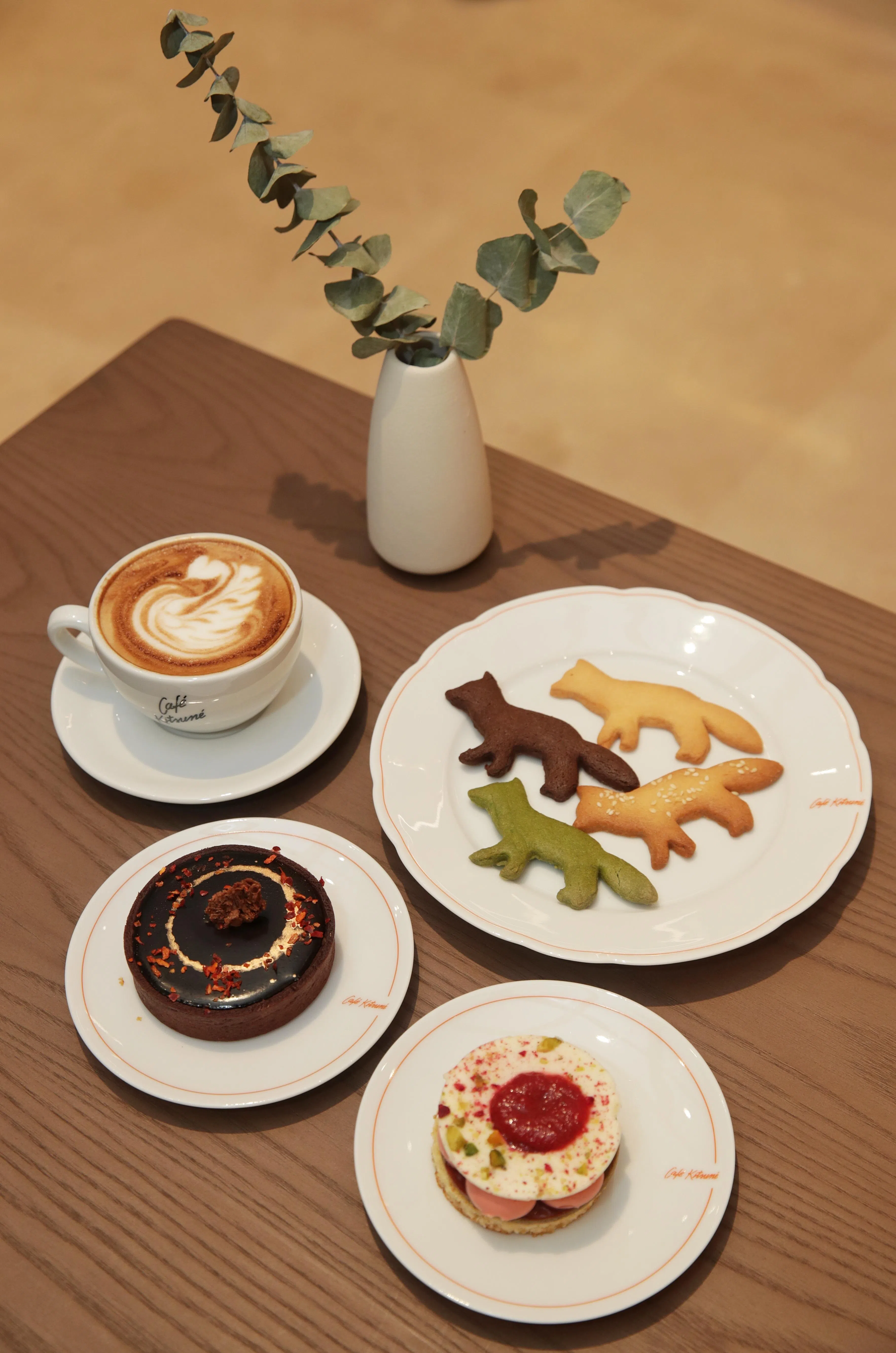 Cafe Kitsune’s (clockwise from left) coffee, fox-shaped shortbread, yuzu pistachio strawberry entremet and chilli chocolate tart.
