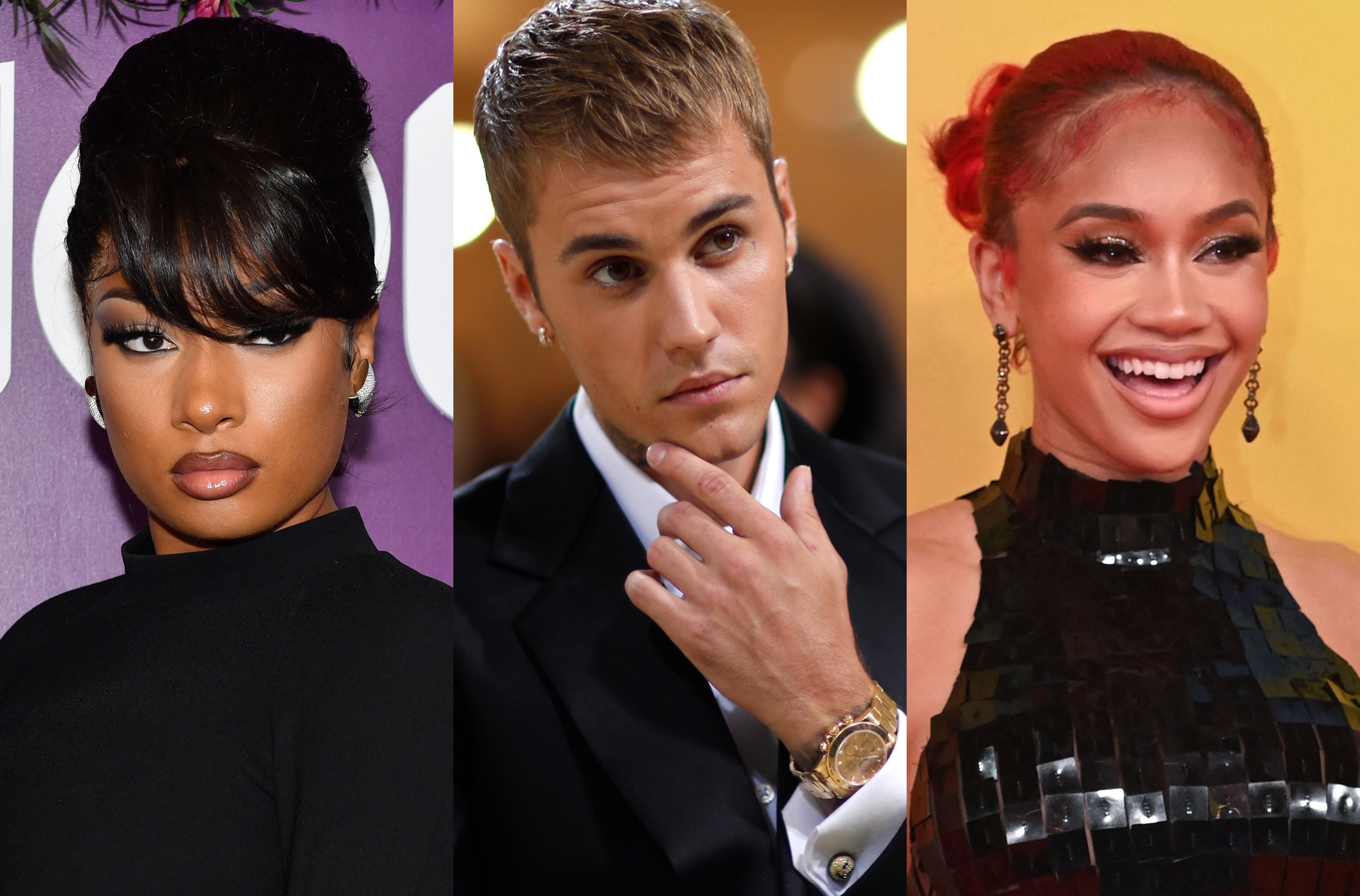 Fast-food companies are tripping over themselves to align their products with stars such as (from left) Megan Thee Stallion, Justin Bieber and Saweetie.