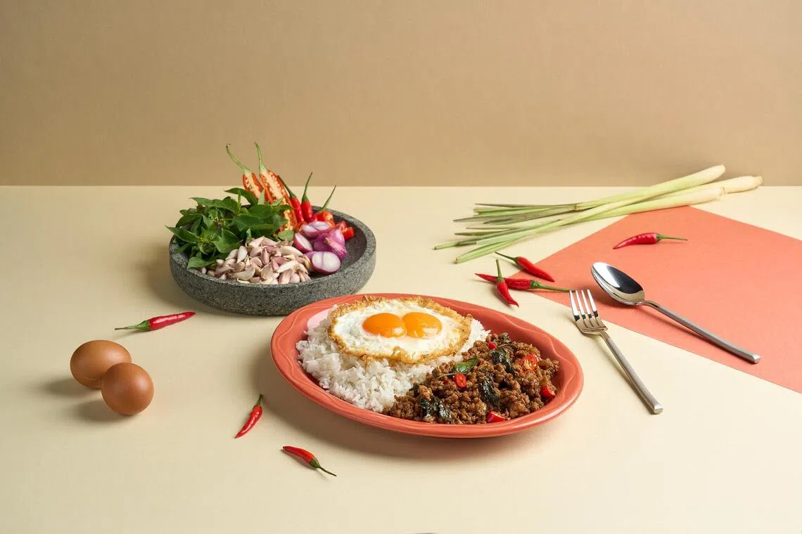 Thai stall Thai’d Up’s Signature Pad Kra Pow with Double Egg on Rice.