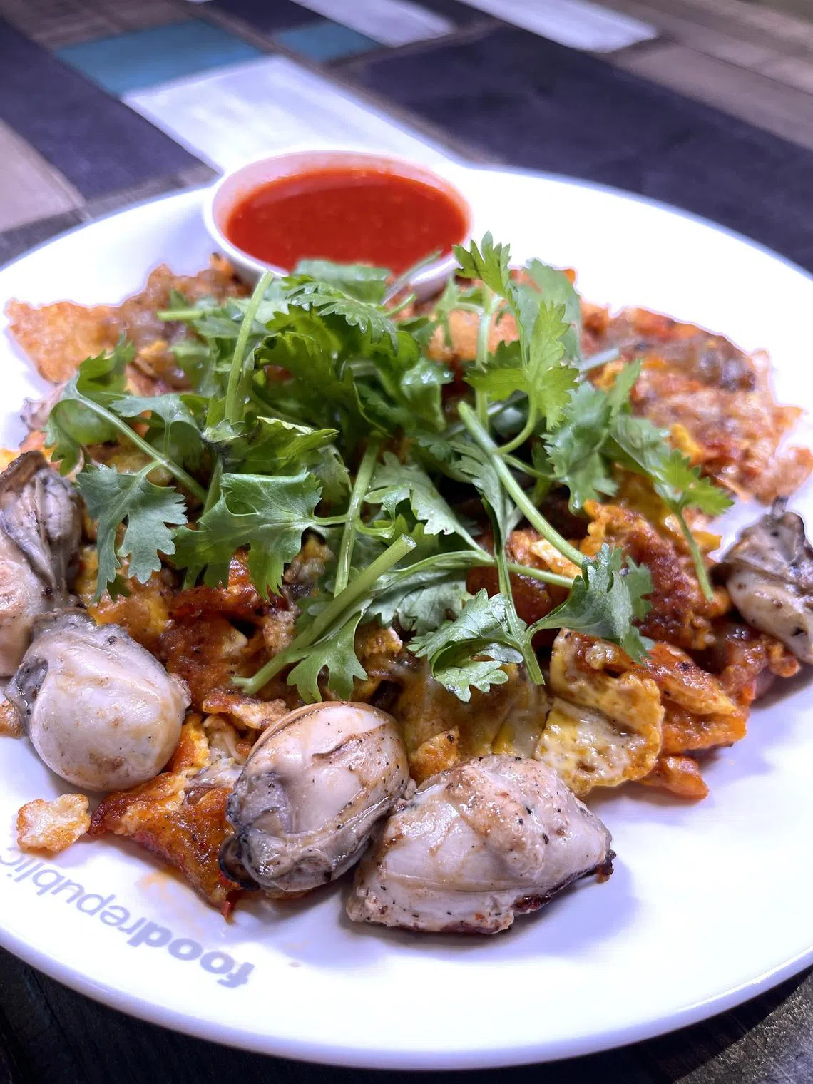 The egg-and-flour mixture is slowly and steadily fried into a golden brown pancake with crispy edges. Frozen South Korean oysters, which are juicy and delectably briny, are used. Six to seven oysters go into the small version, which is sufficient for two to share. The stall is also generous with its garnish of fresh coriander.