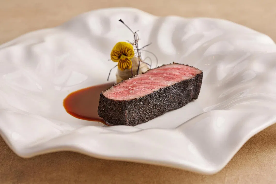 A main course of Miyazaki beef is, likewise, not too rich. The meat is coated with leek ash and served with a cocoa jus, both of which have hints of bitterness to offset the extravagant marbling in the wagyu.