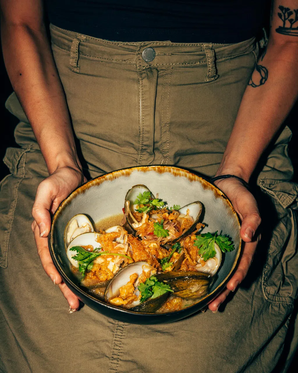 Another good one is Buah Keluak Pork Belly ($26), properly punchy and served with achar, serundeng and a sprinkling of aromatic ginger flower. In retrospect, we should have ordered Fried Bao Buns ($6) for mopping-up operations.
