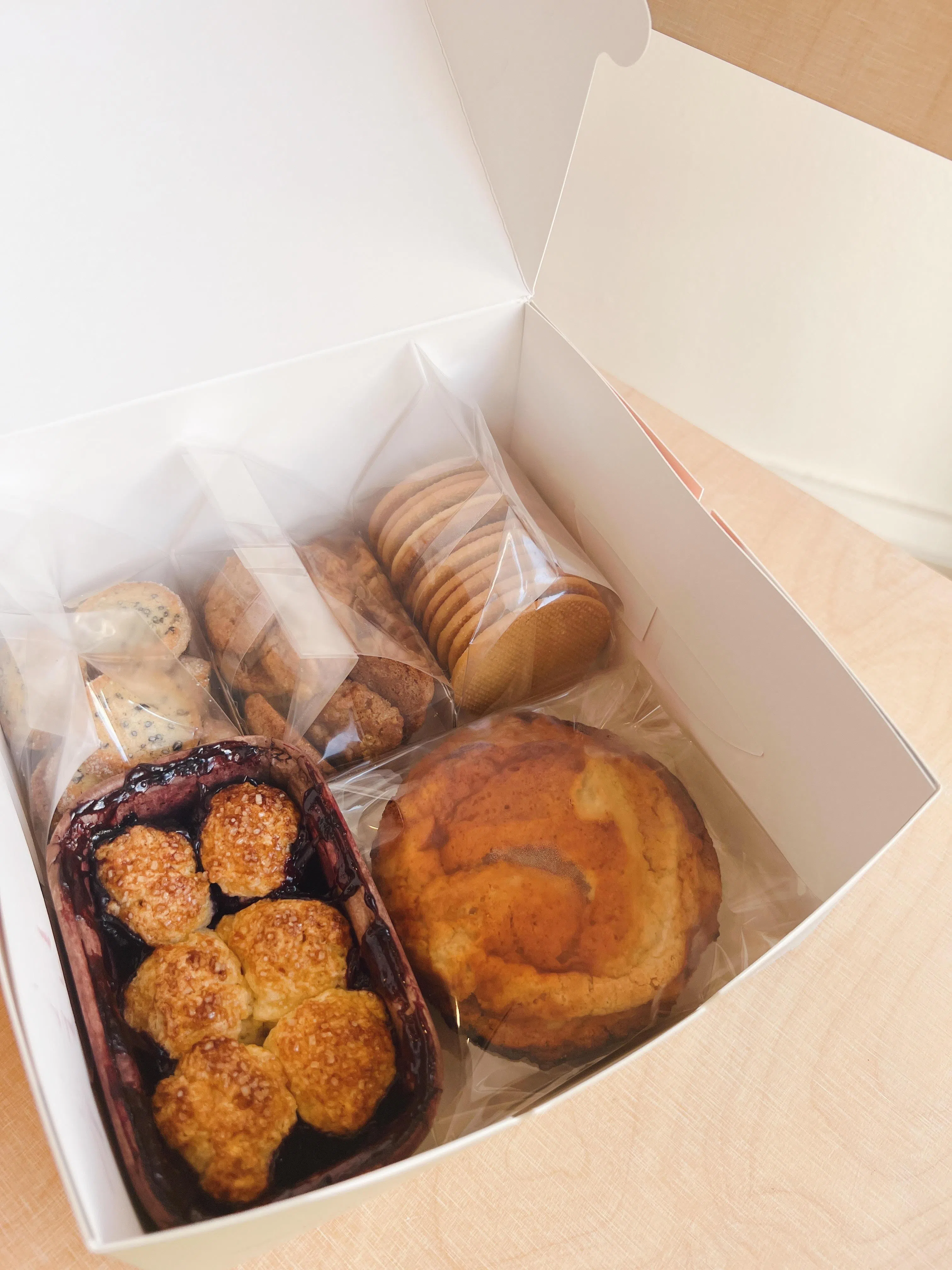 There are two of them in the $26 box. Other treats include three each of Roasted Rice Tea Caramel Sandwich Cookies and Ovaltine Caramel Sandwich Cookies; 12 aromatic Roasted Sesame Sables, 12 very crunchy Pecan Praline Cornflake Cookies; and Blueberry Cobbler.