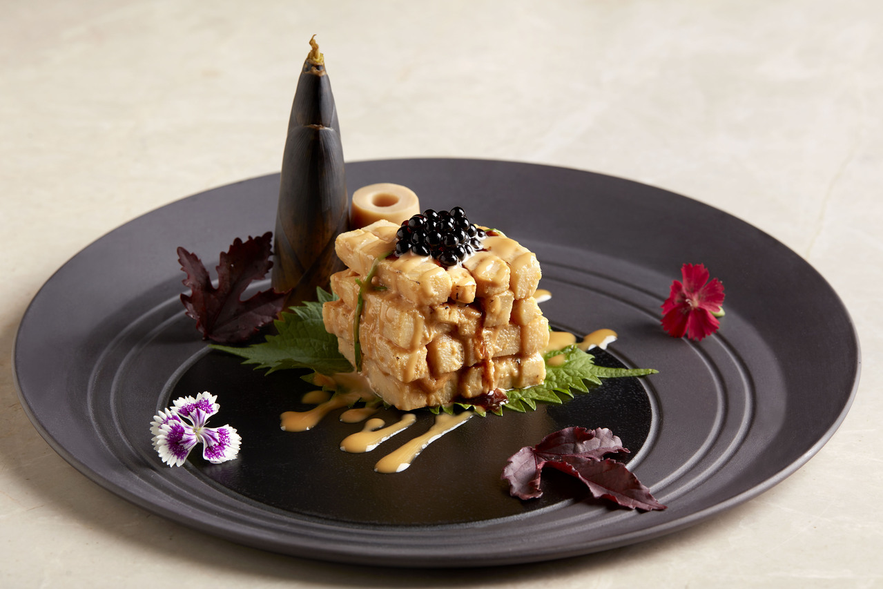 Roasted Bamboo Shoots with Vinegar Pearls and Flaxseed Dressing, by chef Jereme Leung.