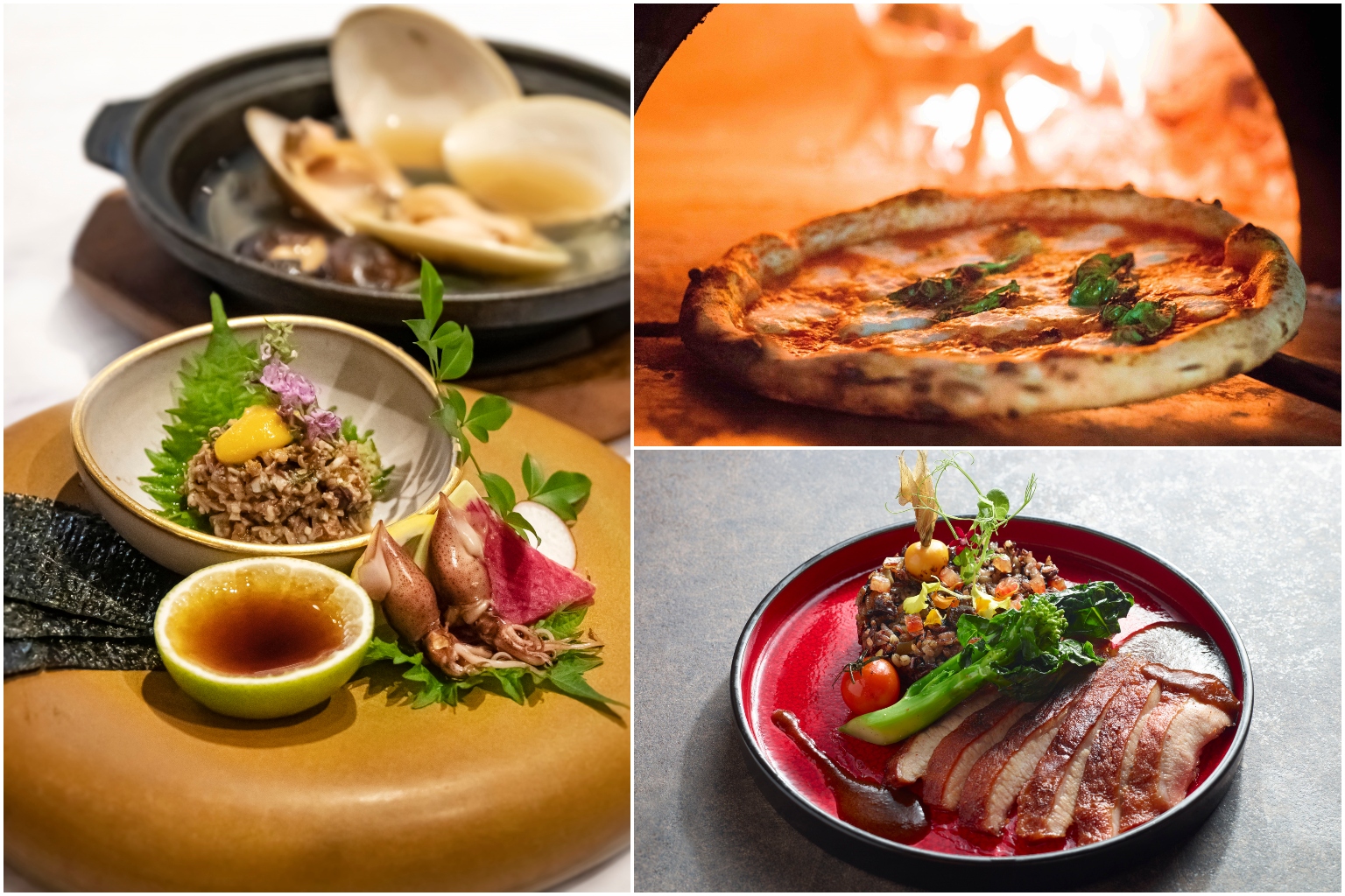 (Clockwise from left) Fat Cow's Sumire Omakase, 800 Degrees Woodfired Kitchen's pizza and Moonbow's Blackberry 4-grain Healthy Rice.