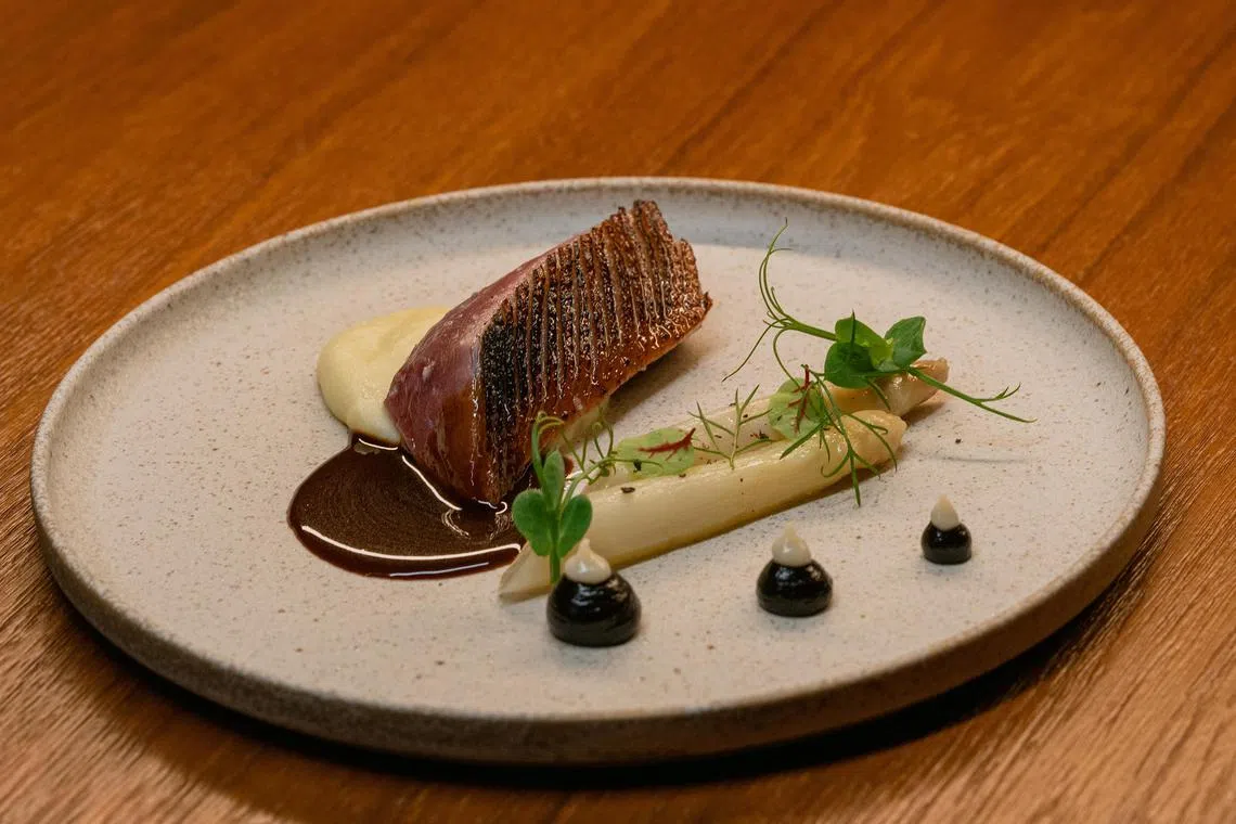 The juicy duck comes with a perfectly roasted crisp skin, and it is served with white asparagus, buttery mashed potatoes, and black and white garlic paste.