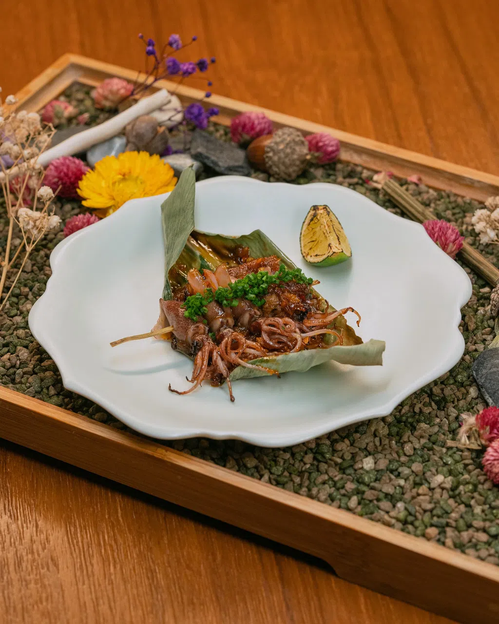 The charcoal-grilled squid has a lovely smoky aroma, elevated with housemade caramelised chilli jam – the chef’s take on local sambal sotong.
