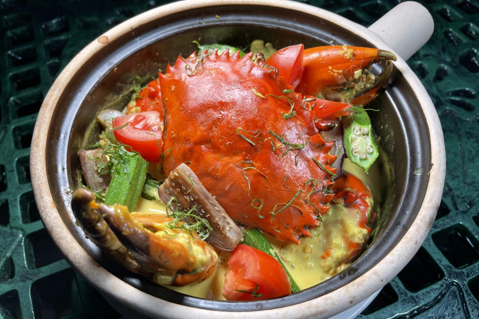 Live Sri Lankan whole crab cooked in the style of Masak Lemak Chilli Api featured at Ah Hoi’s Kitchen.