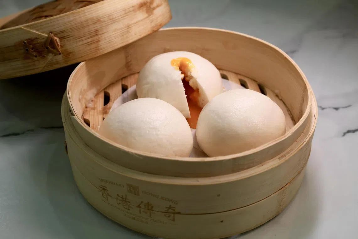 For dim sum, the Lava Egg Custard Bun ($5.80++ for three) is made entirely in-house from Hong Kong wheat flour. Salted egg yolks are baked to release their oil and fragrance, then cooked with butter in a bain marie for the filling.