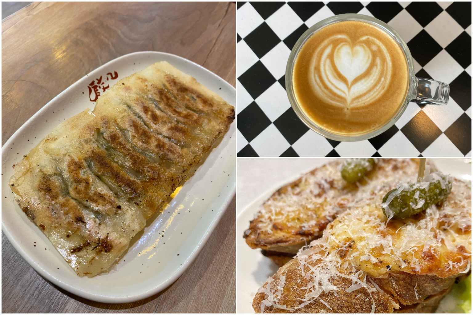 (Clockwise from left) Chao Chao Gyoza, cappuccino from Glass Roasters and Croque Kinoko from Necessary Provisions.