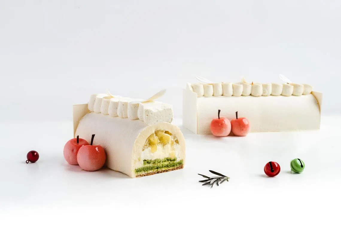 The Pistachio Pomme Log Cake ($108) is similarly ethereal, with pistachio sponge, vanilla cream and green apples layered atop a biscuit base. Best of all, each log is decorated with two mini Christmas Apples filled with zingy, crunchy cubes of Granny Smith.