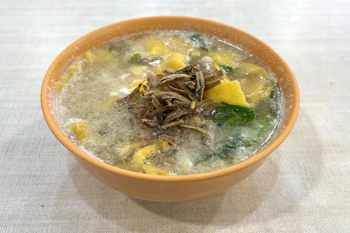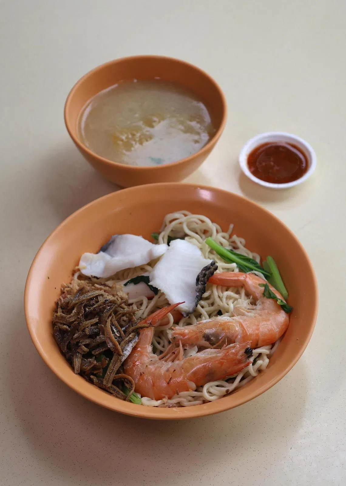 The savoury dressing is dark soya sauce-based. Ms Lu procures fresh glass prawns from the market every morning, and they are crunchy and sweet. Also in the bowl are crabstick and two slices of toman.