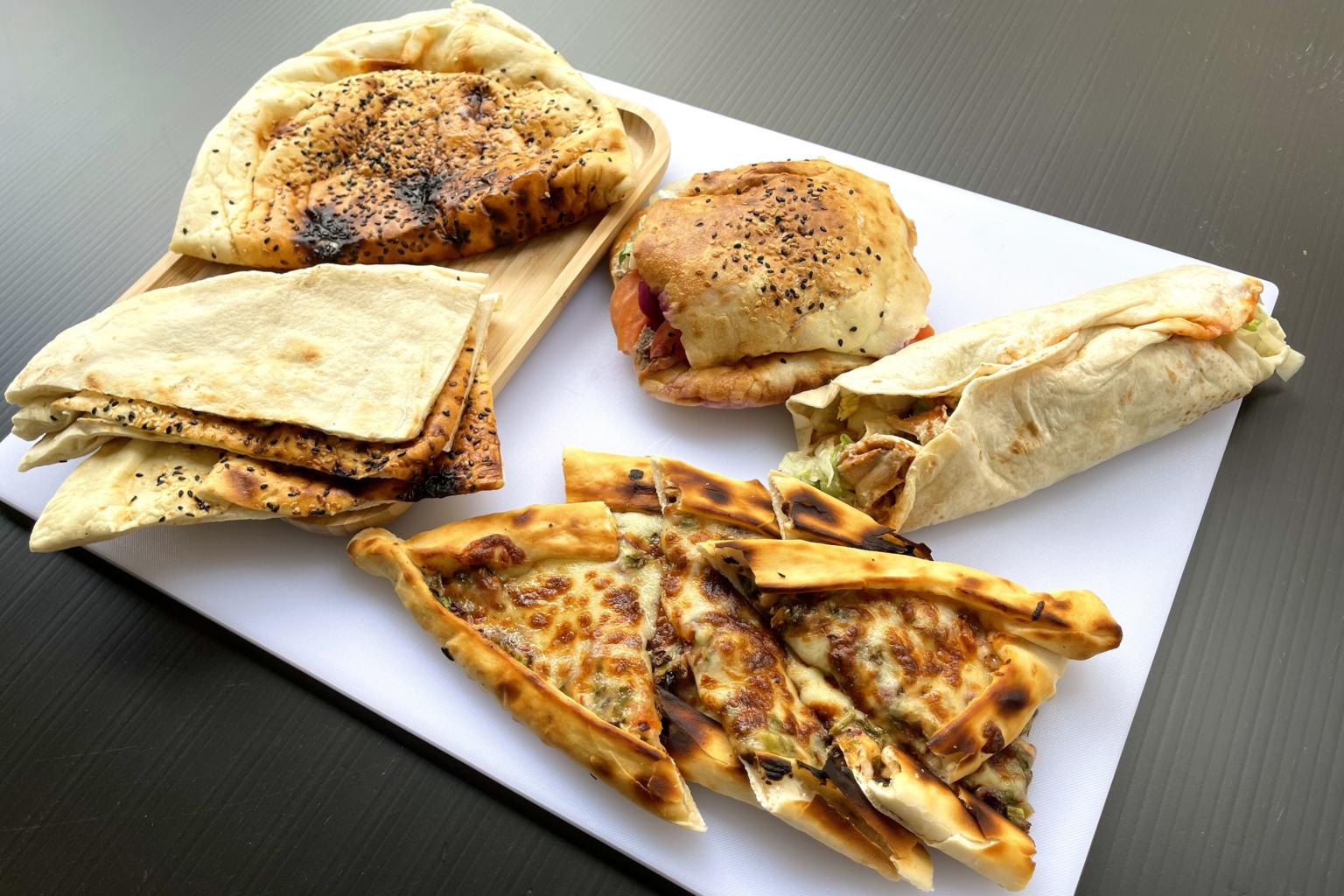 Sesame Bread, Mixed Kebab Tombik, Chicken Kebab Roll and Mixed Vegetarian Pide from Donergy Turkish Kebab.