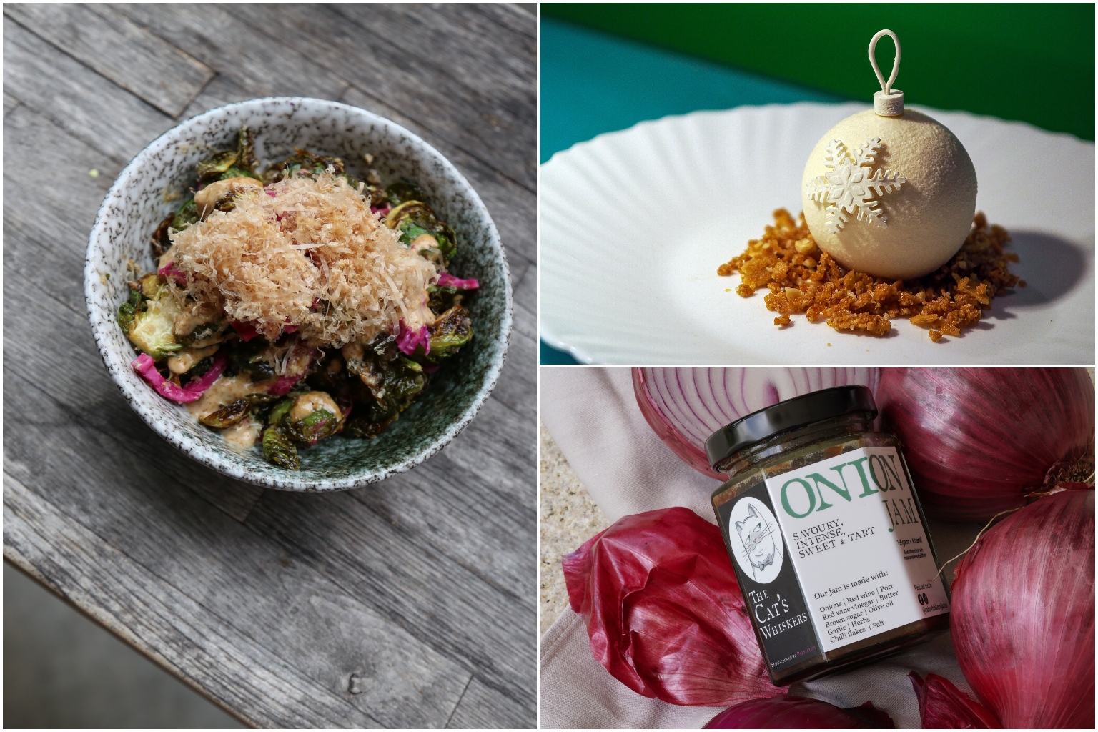 (Clockwise from left) Roasted Brussel Sprouts from Habibi-san!, Jaune from Mad About Sucre and The Cat's Whiskers Onion Jam.