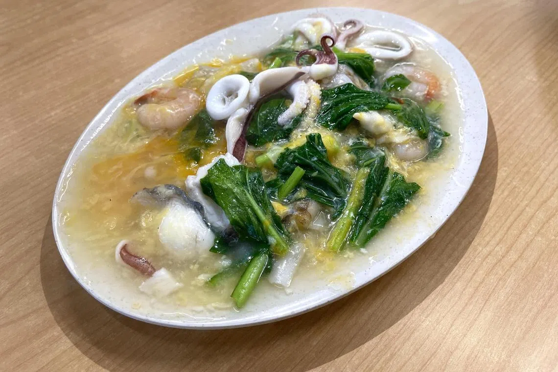 The eatery’s seafood hor fun with egg ($8++ for small, $14++ for large) is light-coloured with a clear gravy, but packs wok hei and plenty of seafood and cai xin.