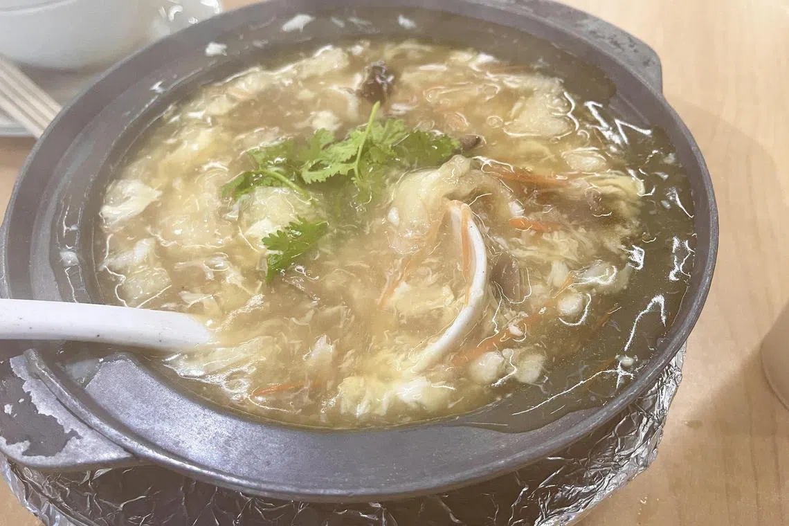 The soup is chockful of meaty slivers of crab and large pieces of fish maw with a lovely gummy texture.
