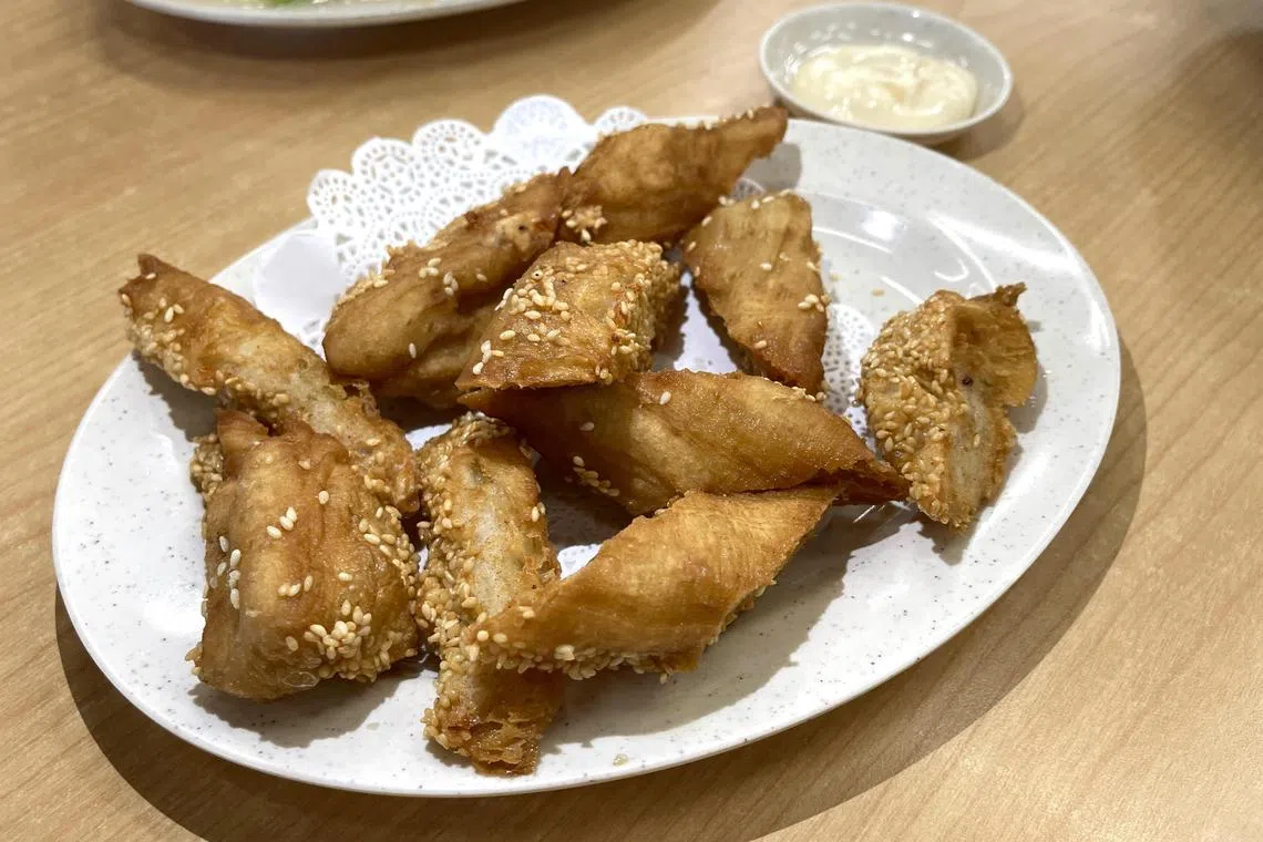 The salad yu tiao ($12++ for small) comprises 10 large pieces of golden fried dough fritters generously stuffed with tasty sotong paste. The fried fritters are crispy on the outside but fluffy inside.