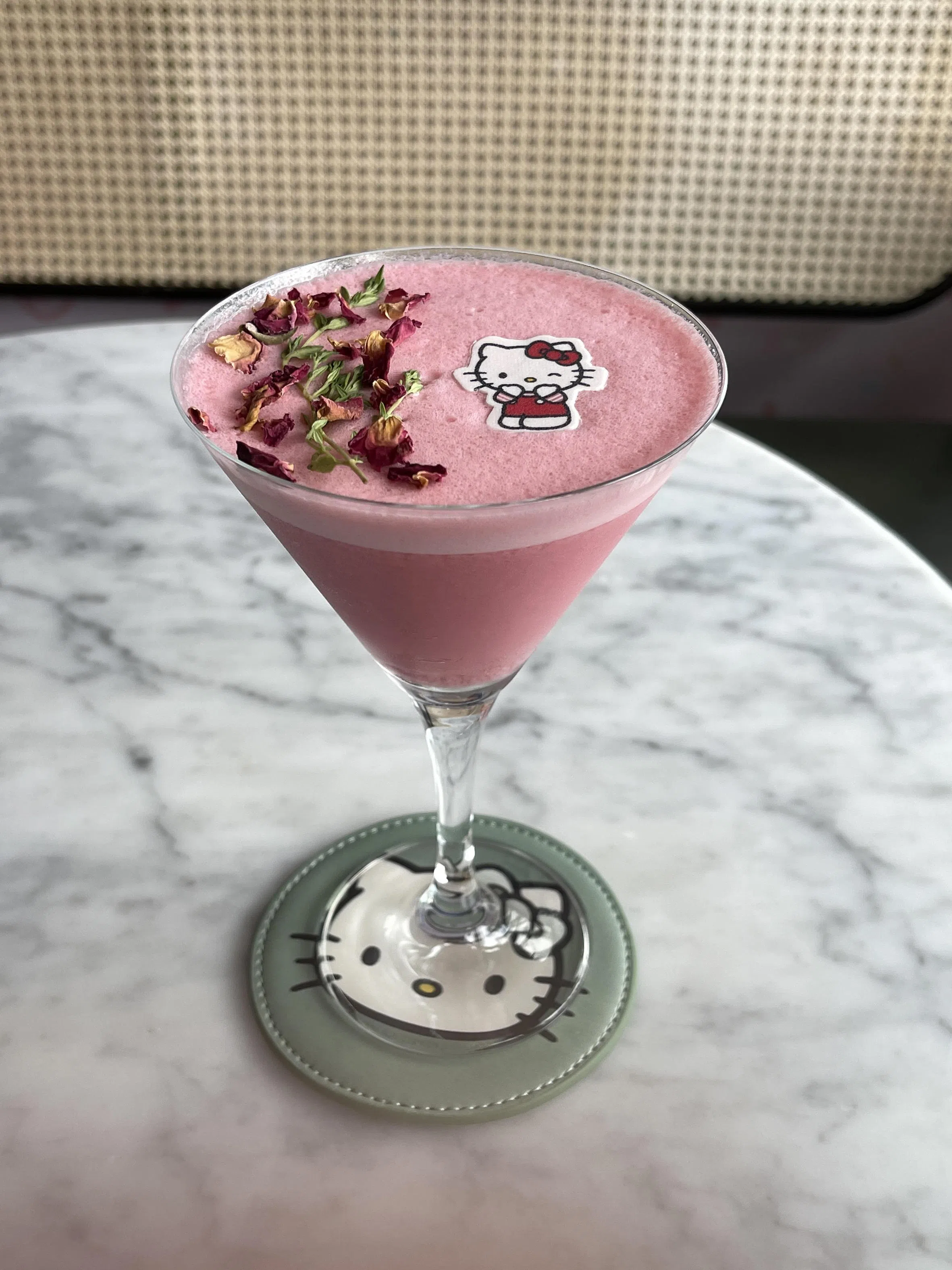 Rosy Dreams ($18++) is a tea-based mocktail that contains milk and is concocted using a rose and strawberry syrup from France. It comes with a motif of Hello Kitty floating on top. The dried rose petals used as garnish are aromatic, though they get in the way of drinking.