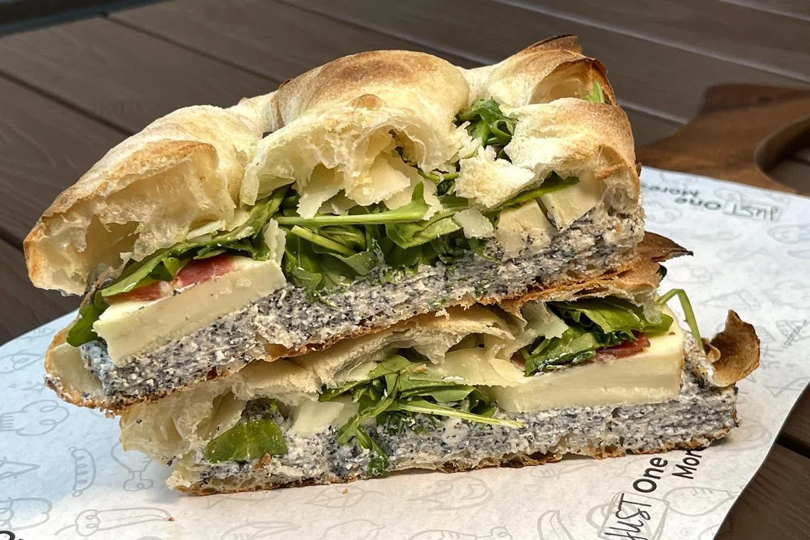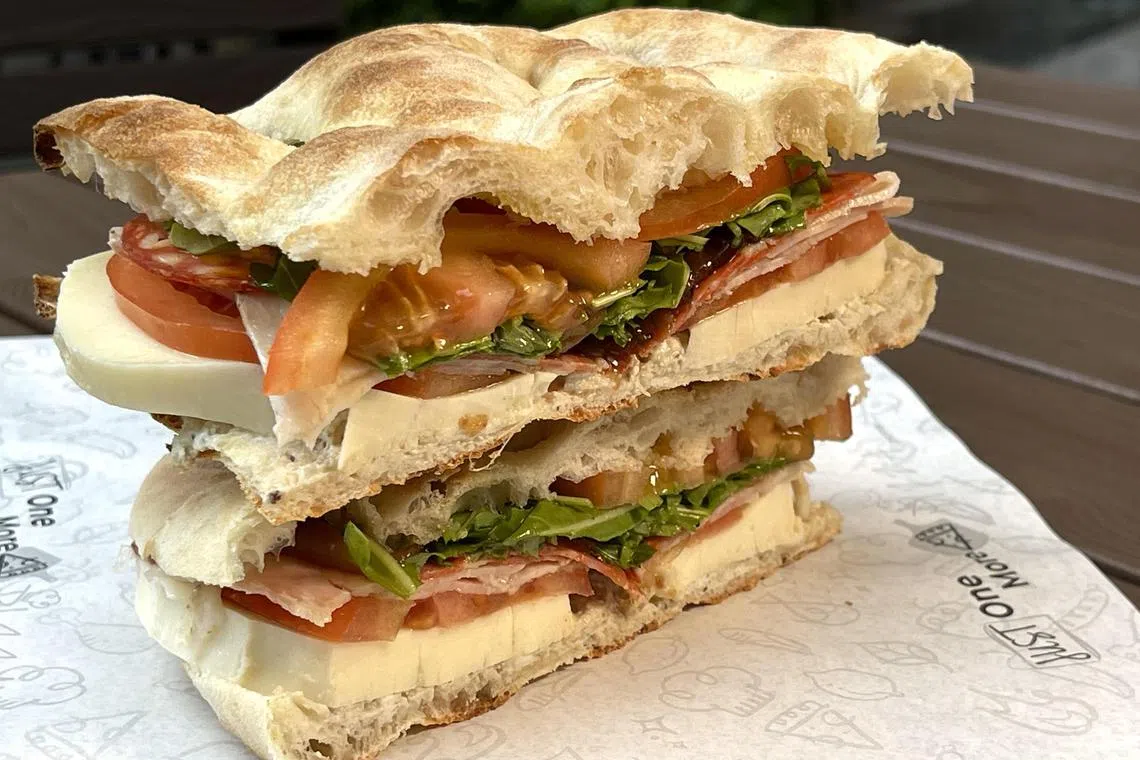 For something with a slightly spicy kick, go for the Focaccia Salami ($19+), which is stuffed with salame piccante (a spicy Italian cured meat), porchetta (Italian boneless pork roast) and thick, round slices of firm mozzarella cheese. Caramelised onion lends a toasty sweetness to the sandwich which is also stuffed with Italian arugula.