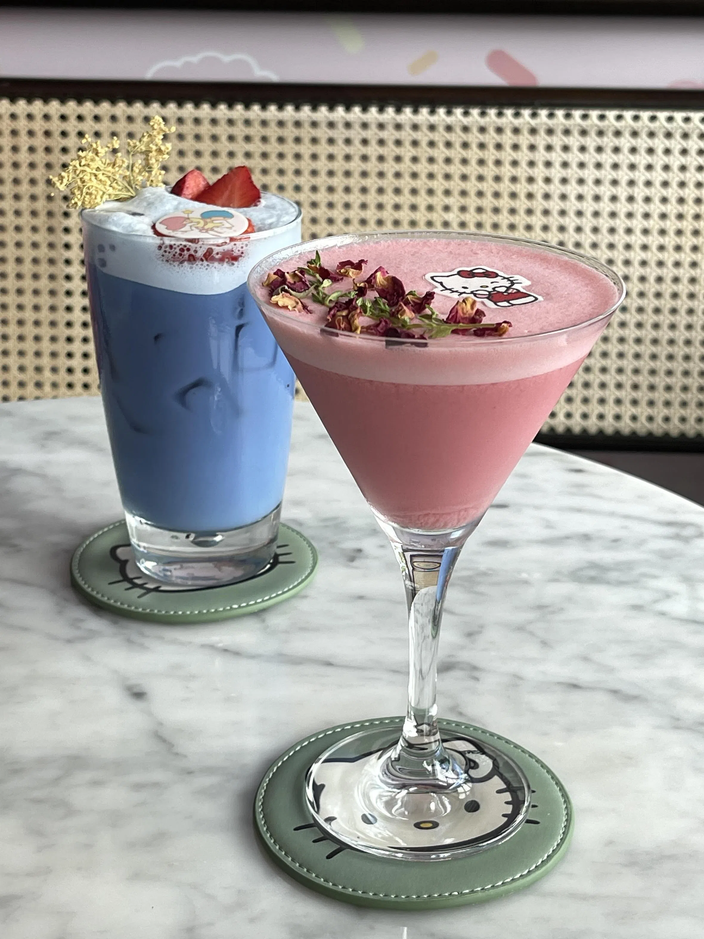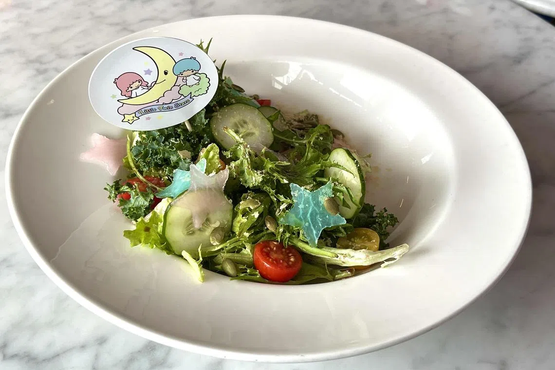 The cafe interior is decorated in pastel colours for its collaboration with Sanrio, the Japanese company which owns the rights to the bow-wearing white cat and other characters. There is also a photo wall outside the bistro for photo opportunities and a merchandise corner.