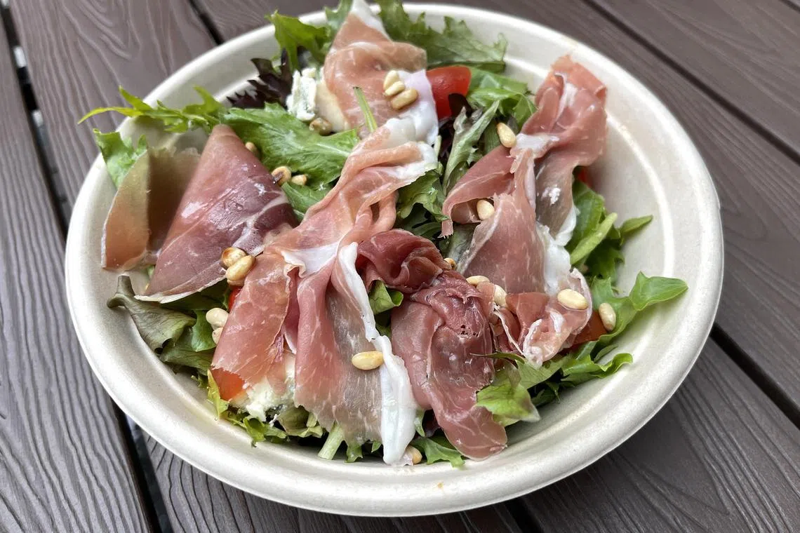 The Salad Perfetto ($16) is a mixed-green salad topped with shavings of prosciutto ham, pine nuts, gorgonzola cheese and pickled baby red and yellow peppers from Italy, and tossed in a housemade dressing of Italian extra virgin olive oil, honey and lemon juice.