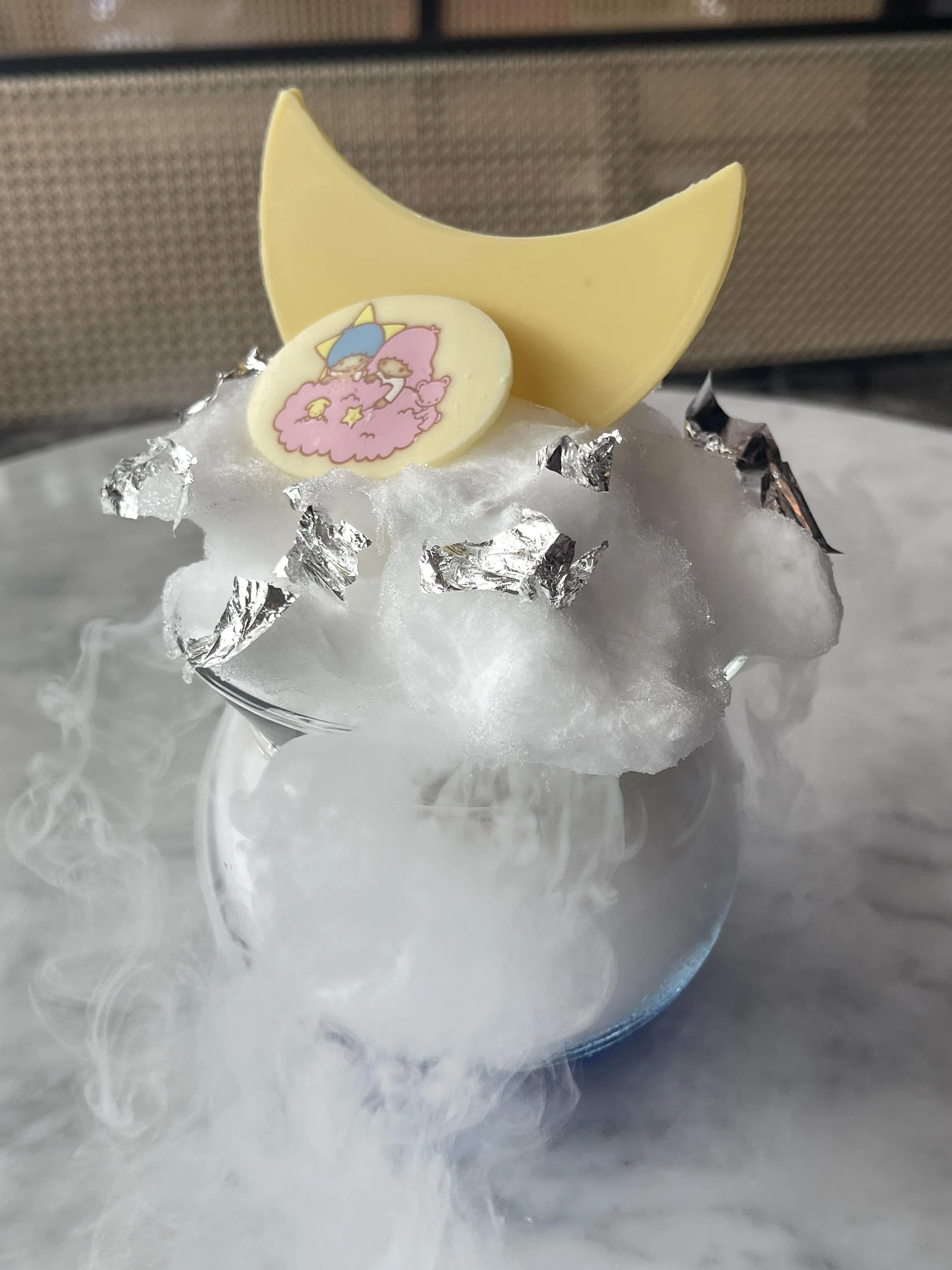 The gelato is hidden under a cloud of white cotton candy decorated with edible silver leaf. The dish containing the gelato is placed atop a glass container filled with dry ice. Upon serving, a blue solution is poured over the dry ice for a misty effect.