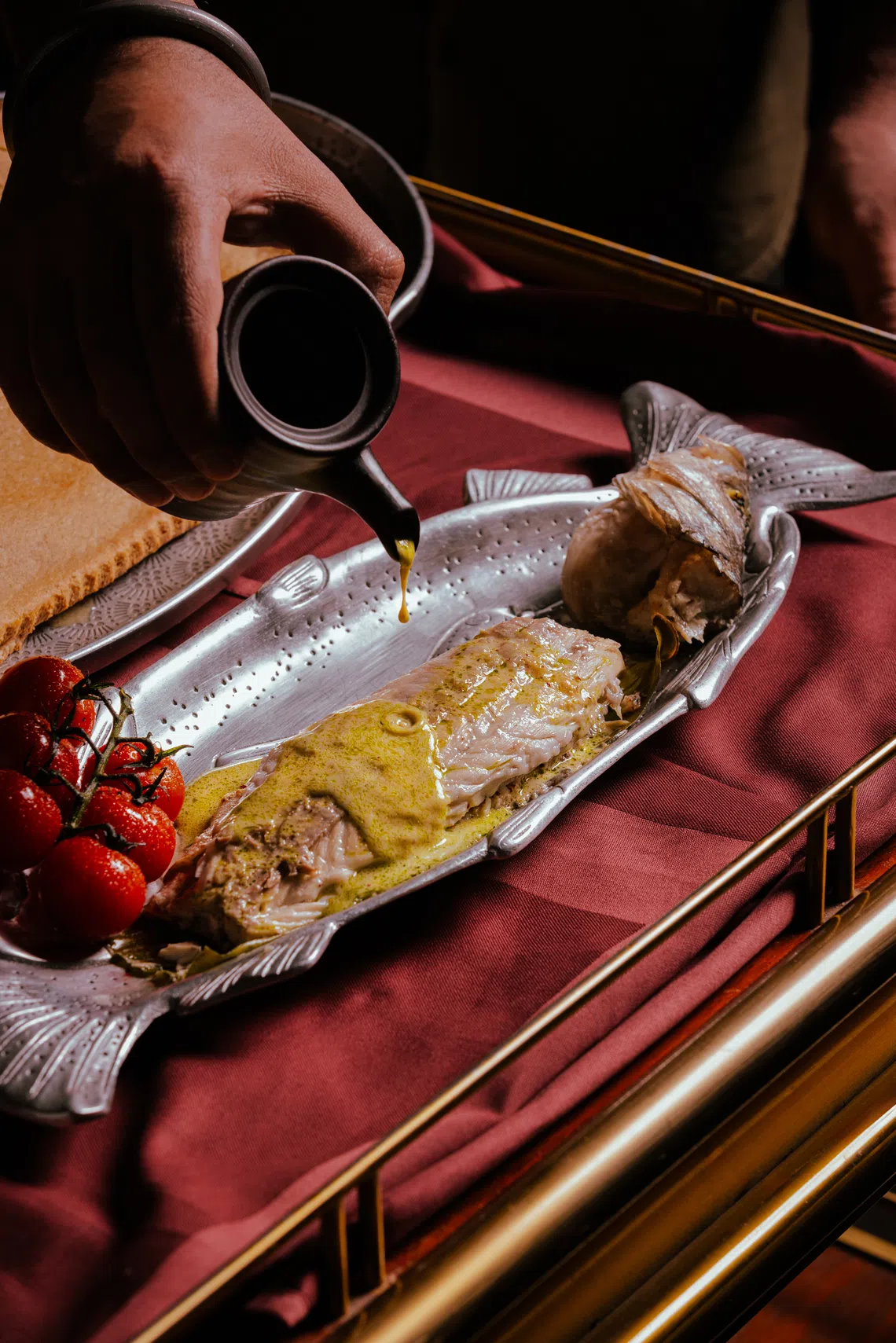 Off to a riotous start, I move on to mains. The Bengal Bake-Off ($108++) is trotted out in show-stopping fashion: a salt-baked seabass emerges from its crust, tender and steaming, and is robed in Kasundi cream.