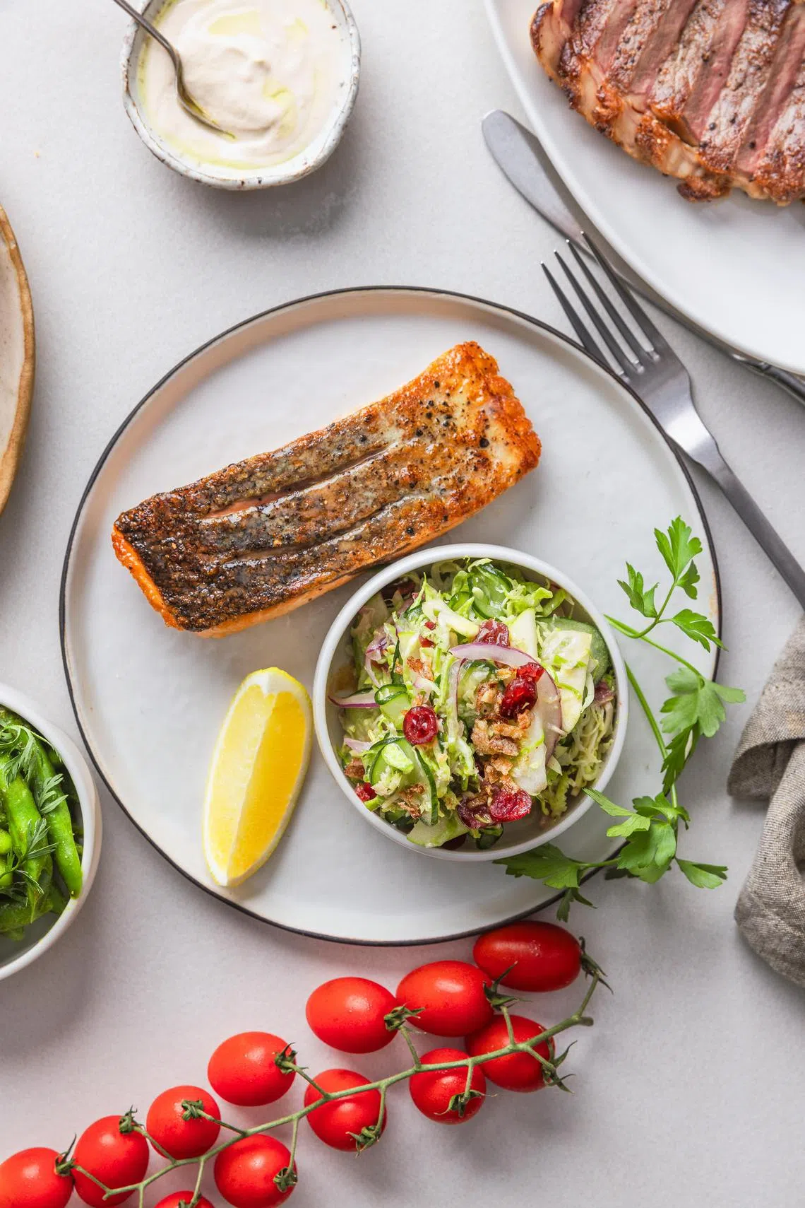Then, choose from a range of sides, which include spiced Madras cauliflower and a refreshing apple slaw.