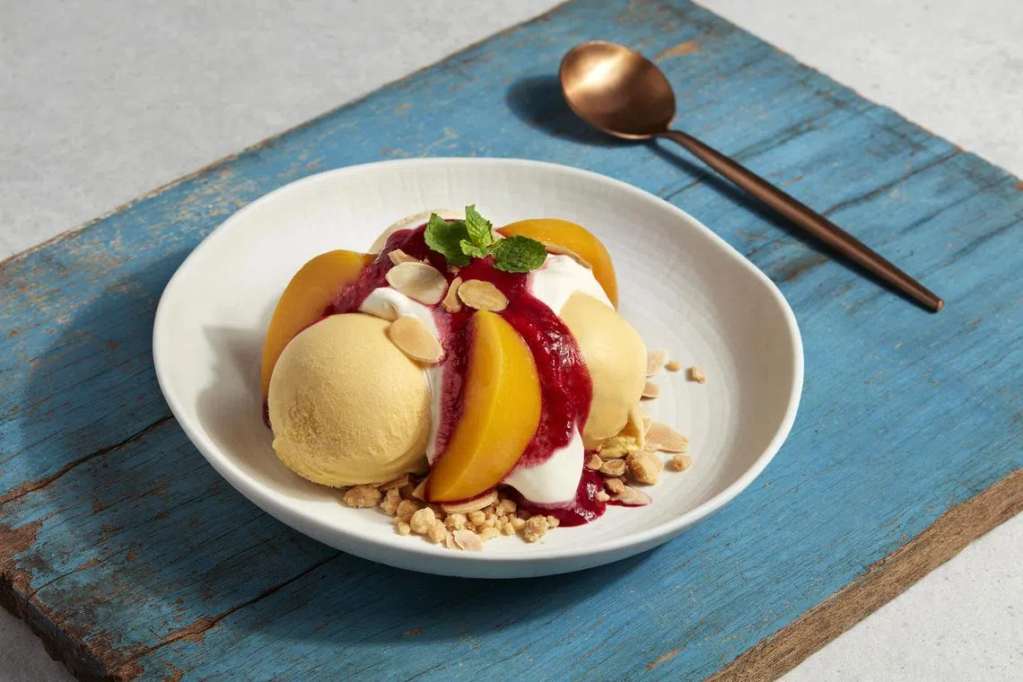 Venue By Sebastian's new peach melba dessert with raspberry sauce, housemade vanilla ice cream and toasted almond flakes.