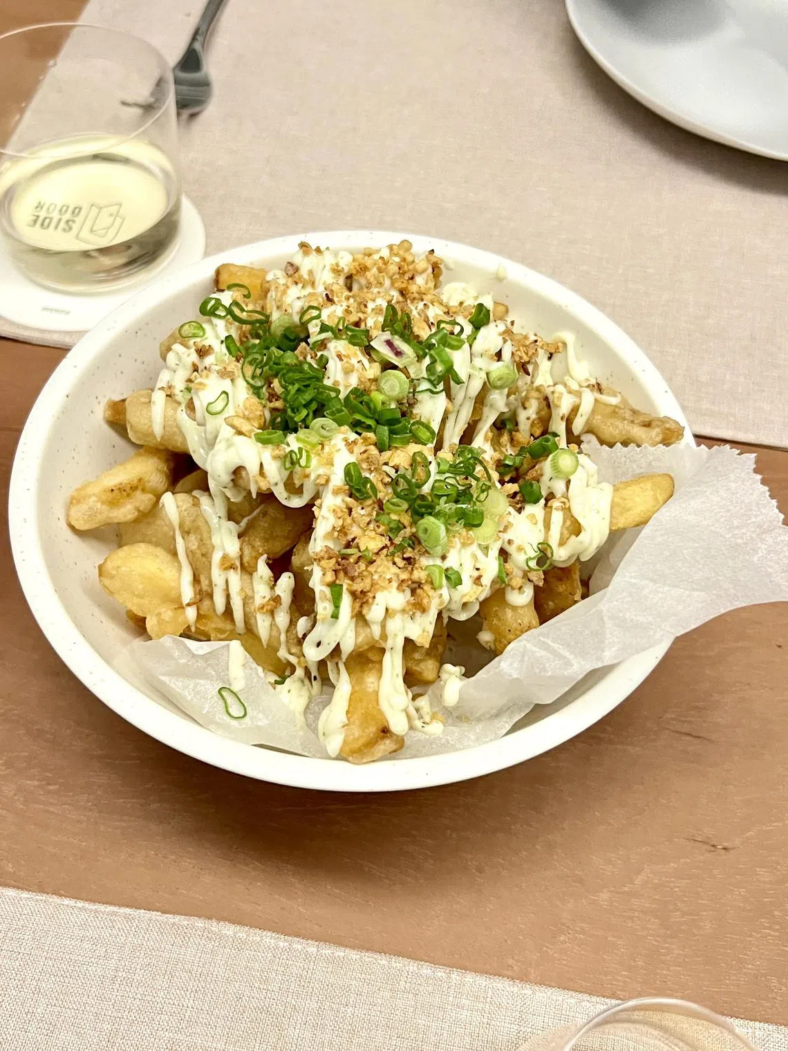 Menu highlights include the must-order double-fried fries ($16), which are coated in a light tempura batter and topped with garlic aioli and crispy garlic bits; and stingray steak ($32) with housemade rempah and preserved radish.
