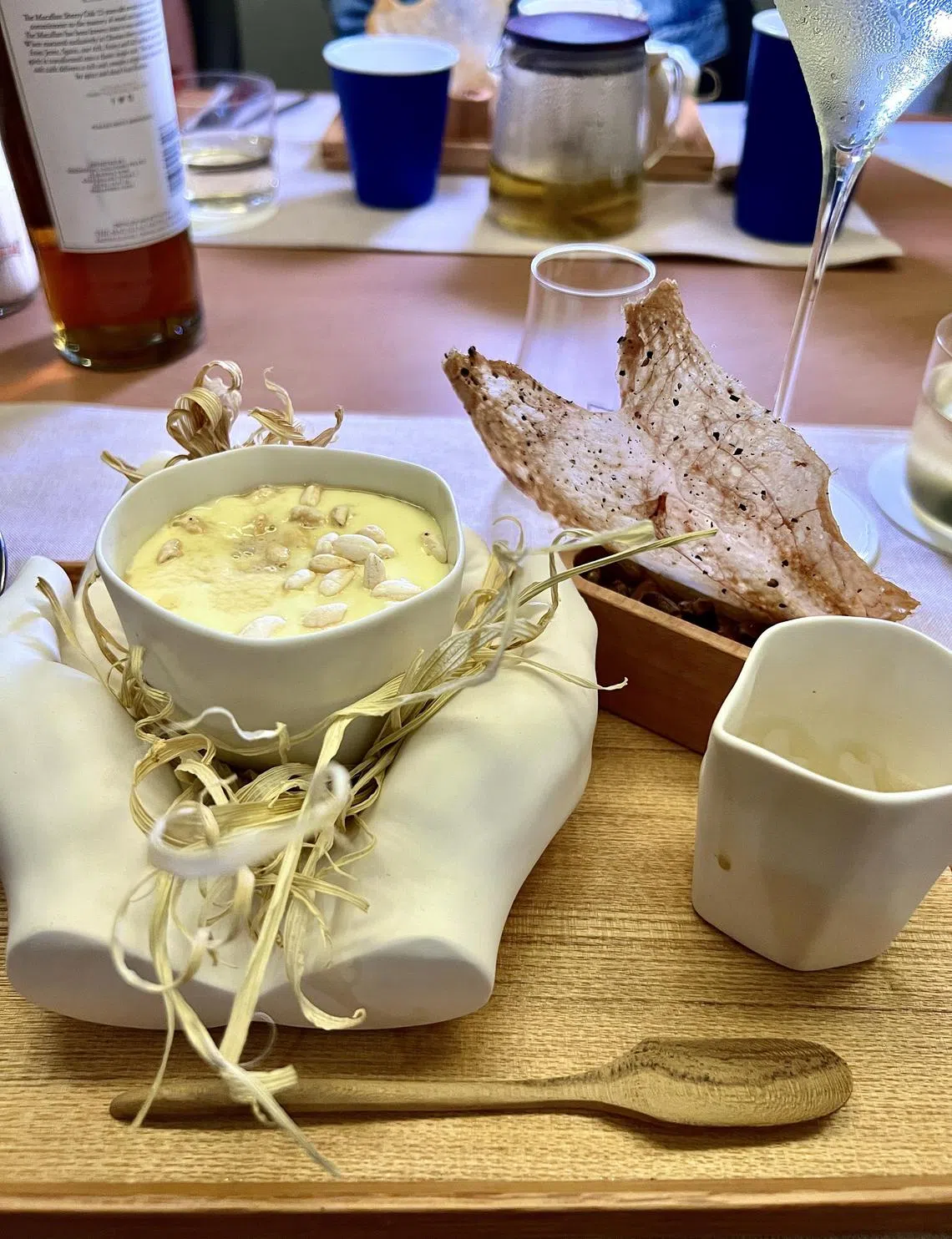 The star dish on the menu is the Texture of Chicken, paired with The Macallan Sherry Oak 12 Years Old. It features a warm chicken soup poured over potato foam and paired with a piece of translucent, paper-thin crispy fried chicken skin.