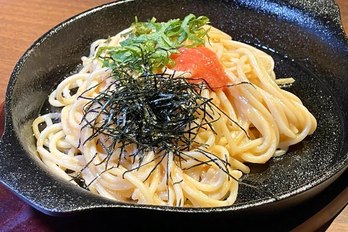 Hakata Mentaiko Pasta ($22++) is served in a hot cast-iron pan, but the noodles remain springy in the residual heat. The jyukusei pasta (aged pasta) is sourced from Shikoku – famed for its udon – and holds up well to cooking.