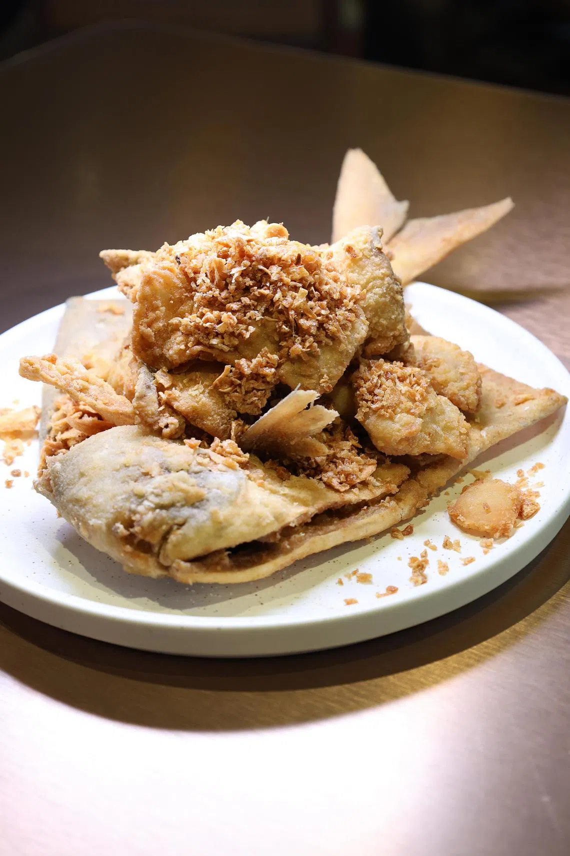 Salt And Pepper Pomfret With Crispy Garlic Chips at Song Yue Taiwan Cuisine.