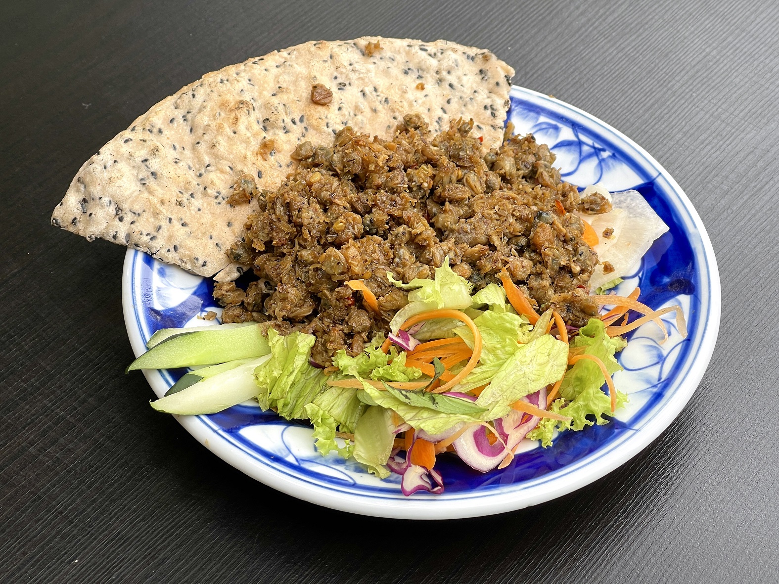 Another dish to try is the stir-fried baby clams with rice cracker ($9.50+). Tender baby clams are boiled and then cooked in a heady mix of onion, garlic, ginger, chilli, pepper and plenty of lemongrass. It tastes rather like a clam and lemongrass-loaded version of hae bee hiam. Eat the clam mixture with the housemade rice cracker that is dotted with fragrant black sesame seeds.