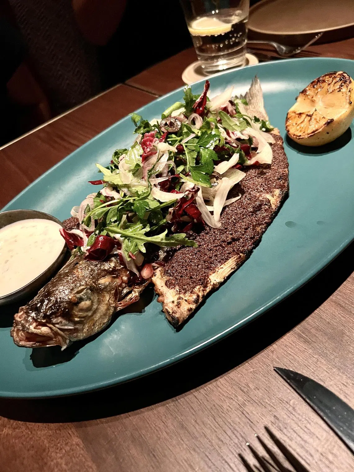 Whole branzino with a sumac tangerine salt crust.