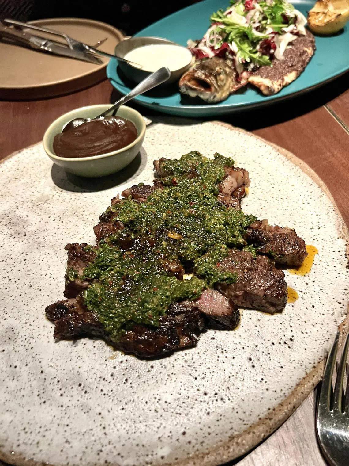 There is a daily selection of smoked meats, seafood and vegetables (seasonal prices apply), such as Australian grain-fed Angus bone-in ribeye (540g) served with palava chilli sauce.