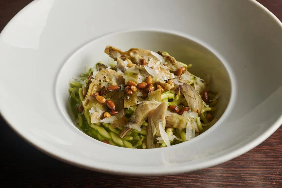 Trofie with Genoese pesto, stracchino cheese and artichokes from Amo.