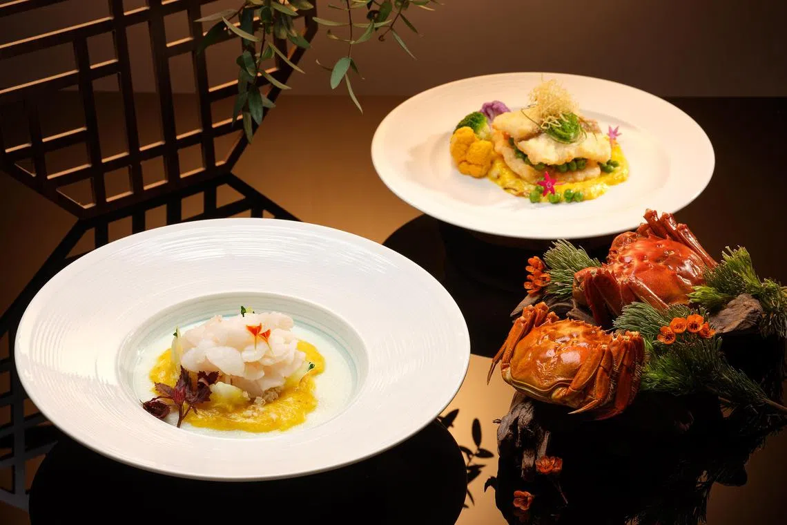 (From left) Steamed King Prawn with Egg White, Hairy Crabmeat and Crab Roe and Deep-fried Grouper Fillet with Hairy Crabmeat and Crab Roe.