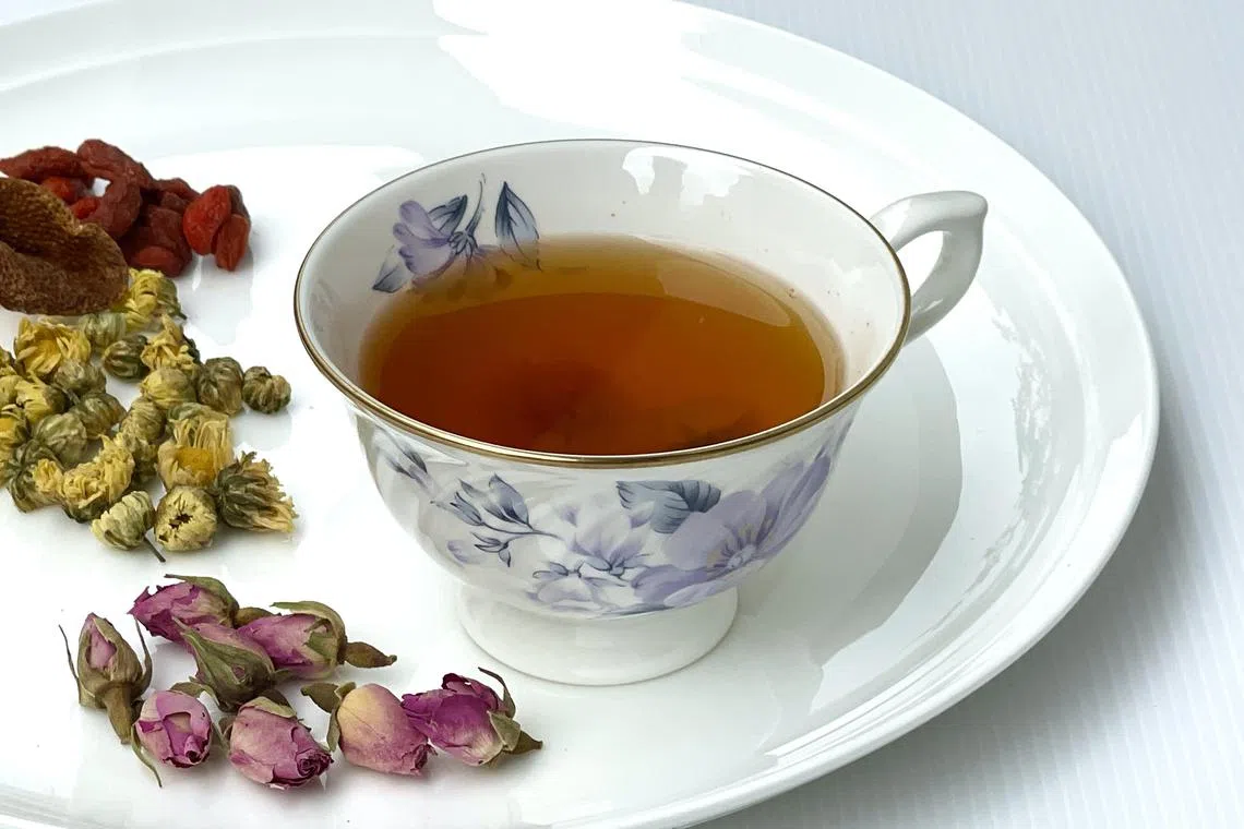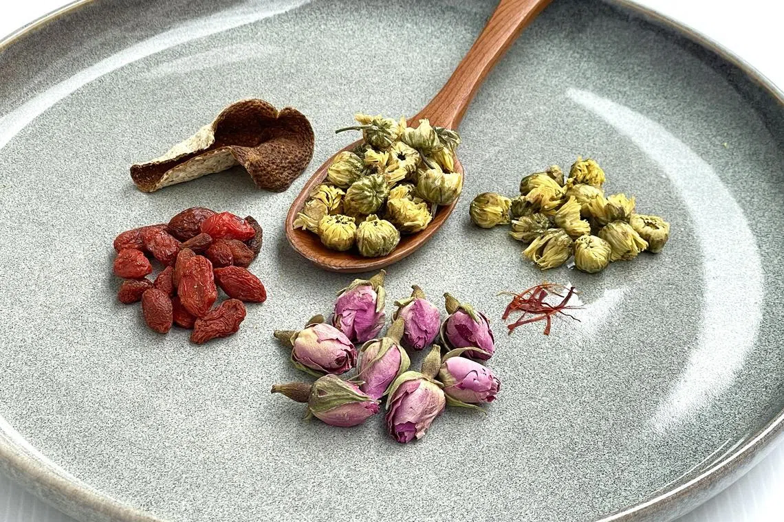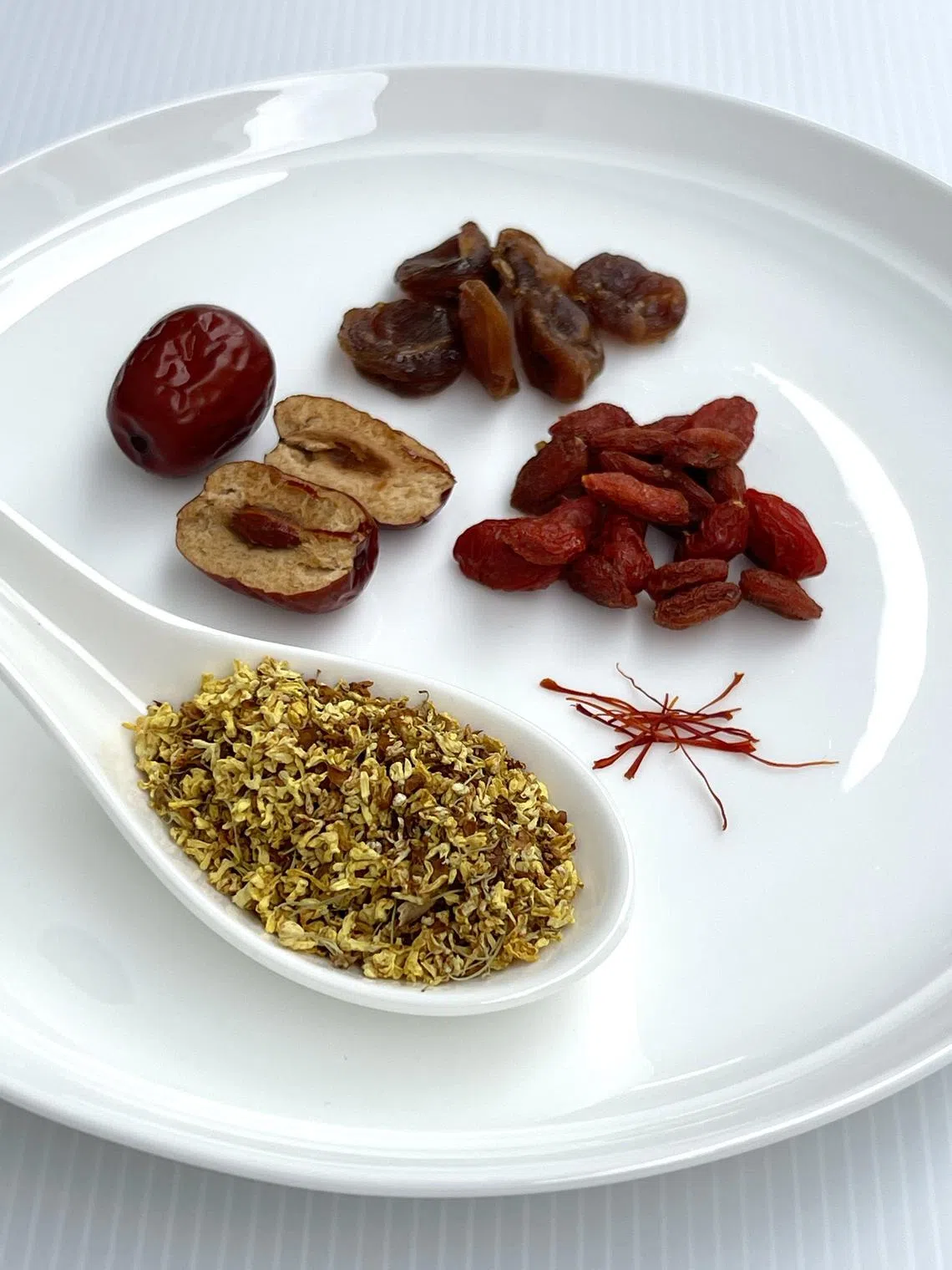 Ingredients for Beauty Tea are osmanthus, saffron, wolfberries, longans and red dates.