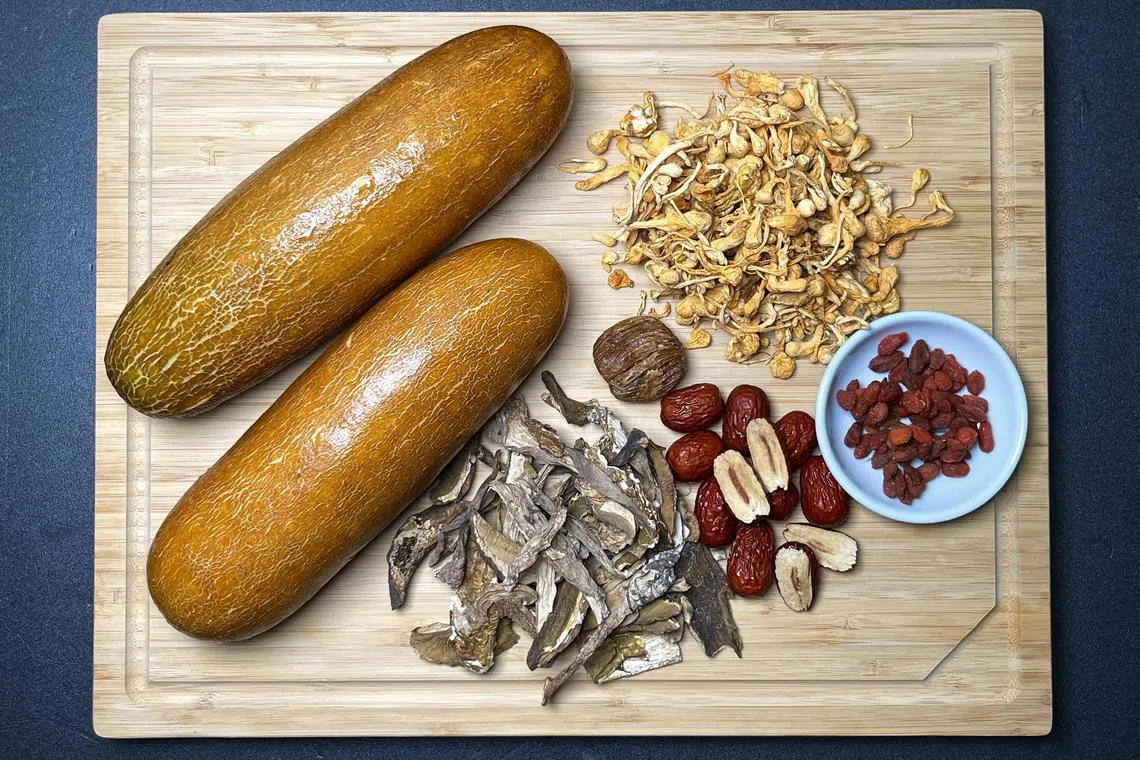 Ingredients for Porcini, Cordyceps Flower And Old Cucumber Soup.