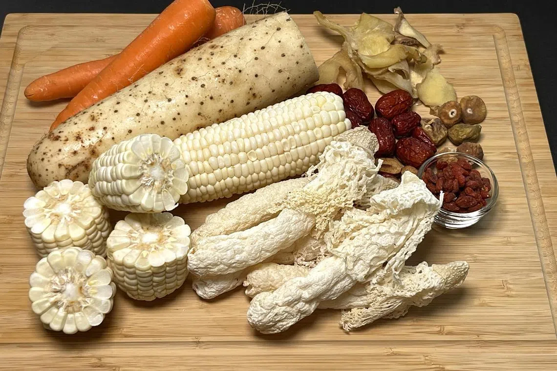 2. Place the red carrot, sweet corn, yu zhu, red dates and dried figs in a pot.