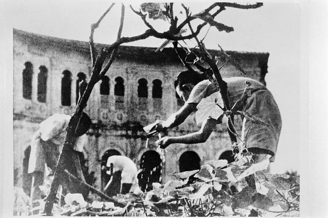 This photo dated 1945 shows the ground in front of St Joseph’s Institution in Bras Basah Road being turned into a vegetable garden as part of efforts to get people to cultivate their own crops, such as tapioca.