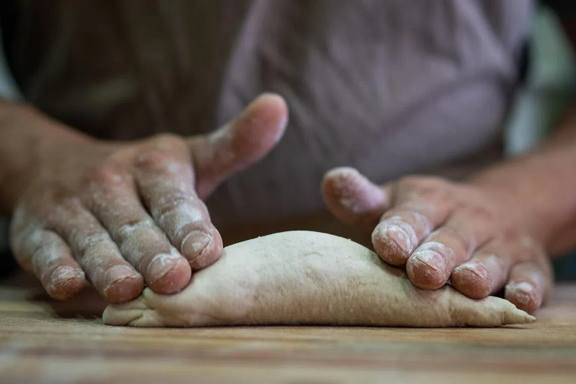 Chef Rivera shapes bolillos by rolling the dough to taper its ends.