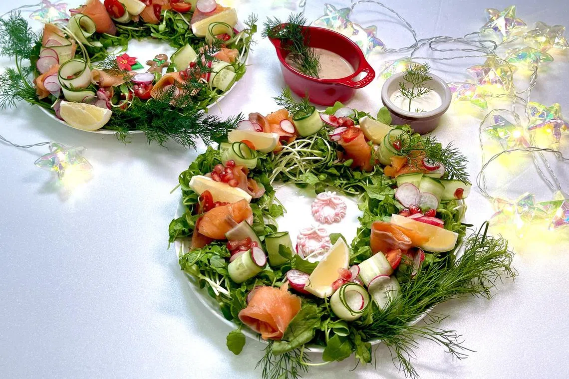 If there is sufficient space in the fridge, prepare the wreath ahead of time and cover it loosely with clingwrap until ready to serve. Layer on the smoked salmon just before serving, so it does not dry out in the fridge.