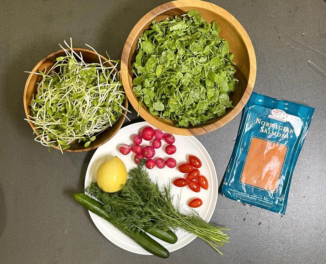 I use rocket leaves and sunflower shoots to make up the base of the wreath, but you can use any salad leaves available in the supermarket. Just be sure to wash and dry them thoroughly before use if they are not prewashed.