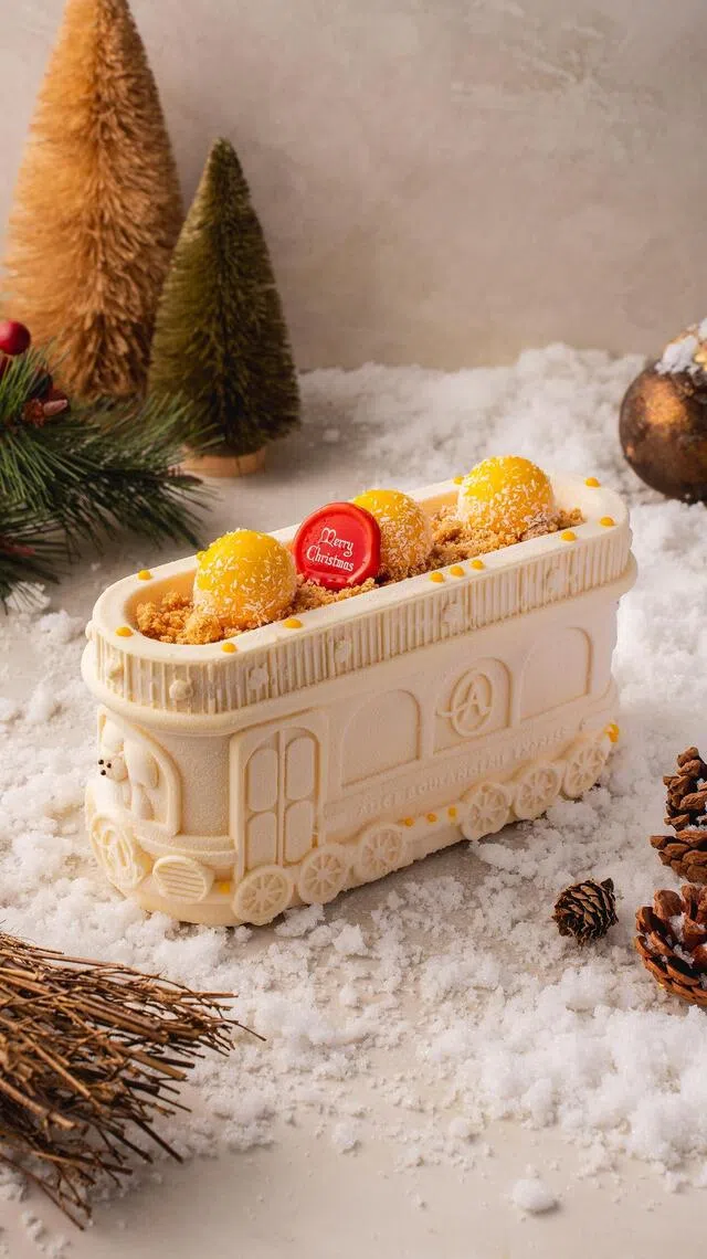 Another train-themed cake is Alice Boulangerie’s new edition of its best-selling train-shaped log cake ($108+, 1kg), which sports a wintery look in 2025 with its chocolate-coconut mousse exterior.