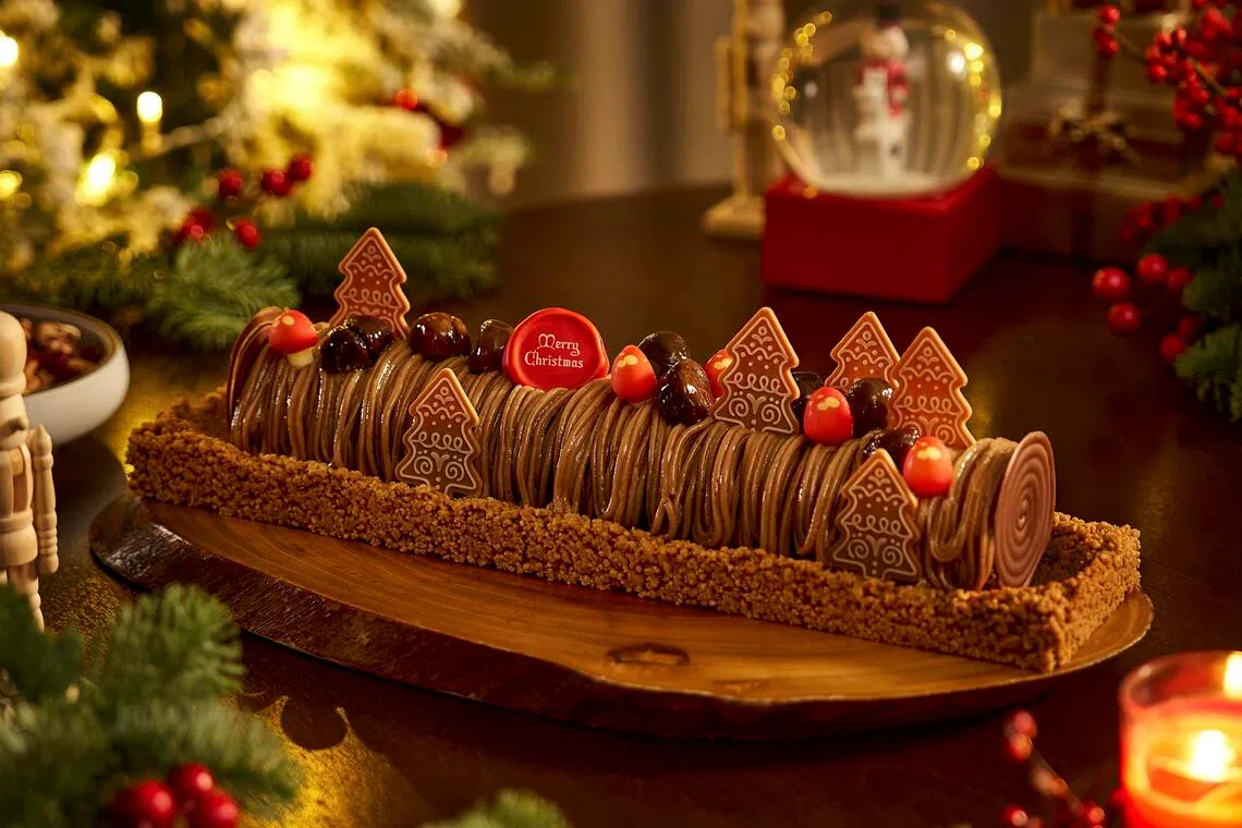 Orchard Hotel Singapore’s new festive cake collection ($92 each) by its pastry chef Nicole Sitoh offers playful renditions of the traditional log cake.