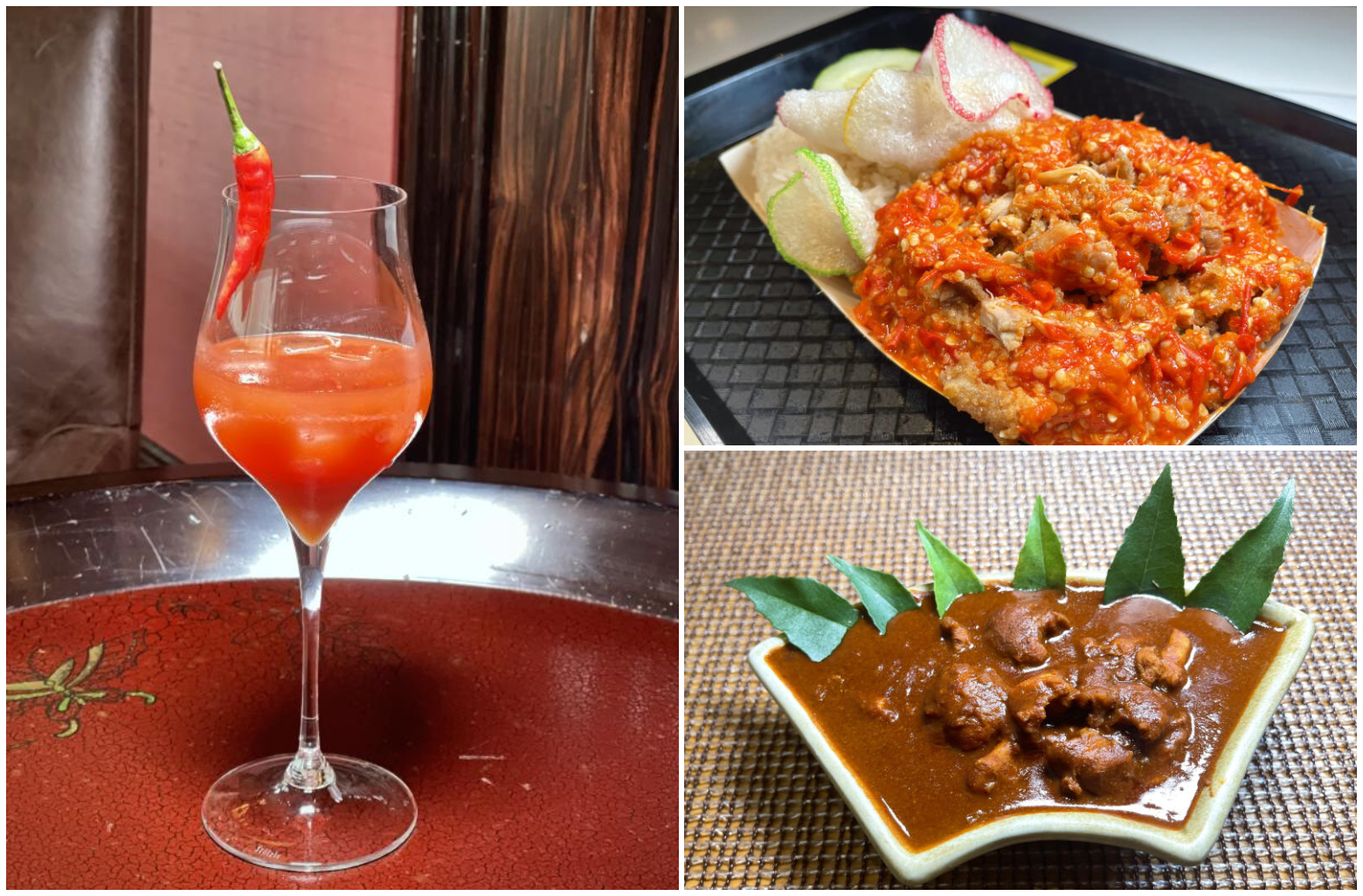 (Clockwise from left) Astor Bar’s Chilli Padi Mary, Papa Ayam’s Ayam Geprek Level 27 and Lagnaa Barefoot Dining's Curry Chicken Level 6.