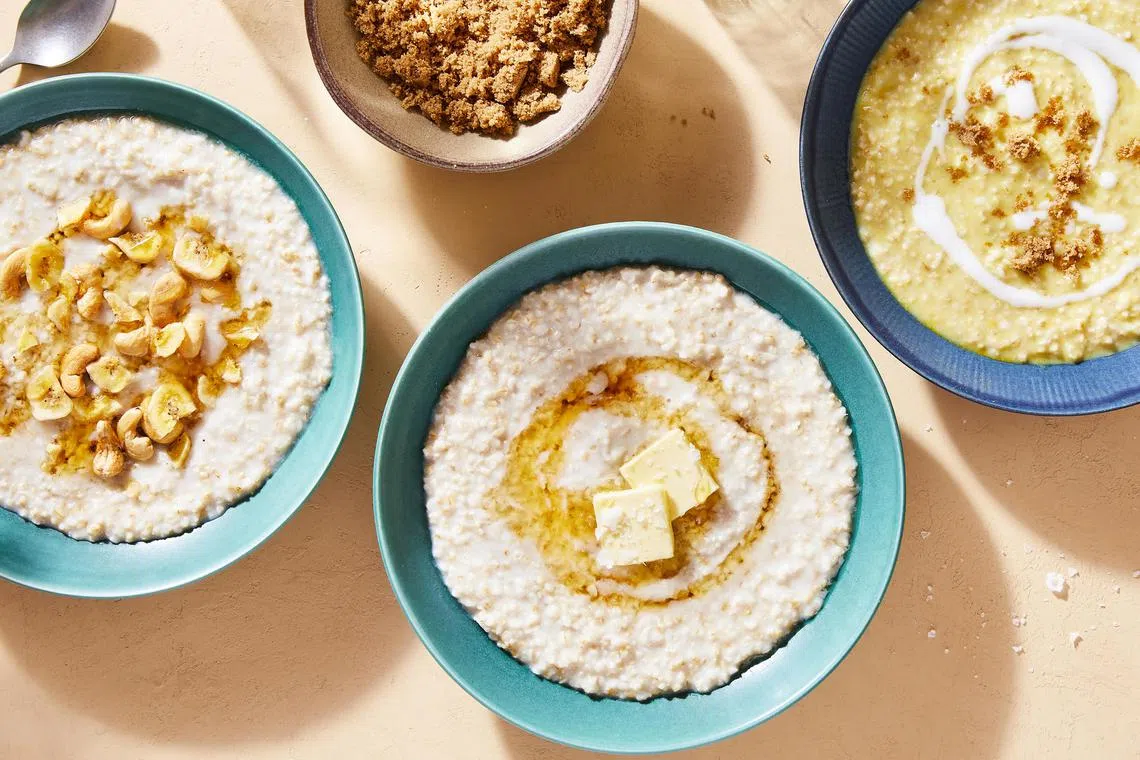 Consider using toppings such as fried shallots and lime juice; shredded cheddar and pickled red onion; olive oil and grapefruit slices; crumbled cooked bacon and marmalade; coconut milk, brown sugar and turmeric; cashews, honey and banana chips; and honey, flaky salt and butter.